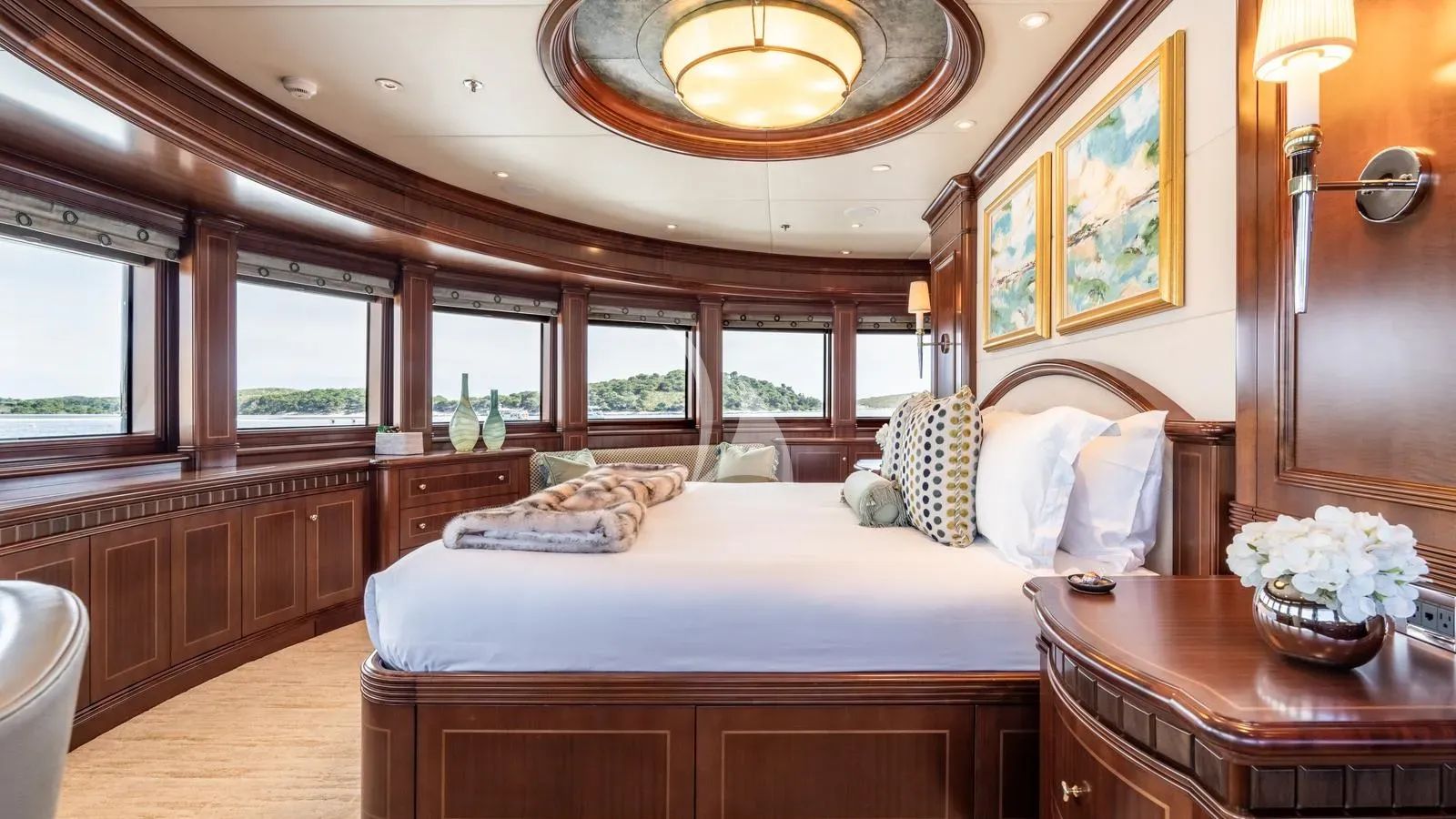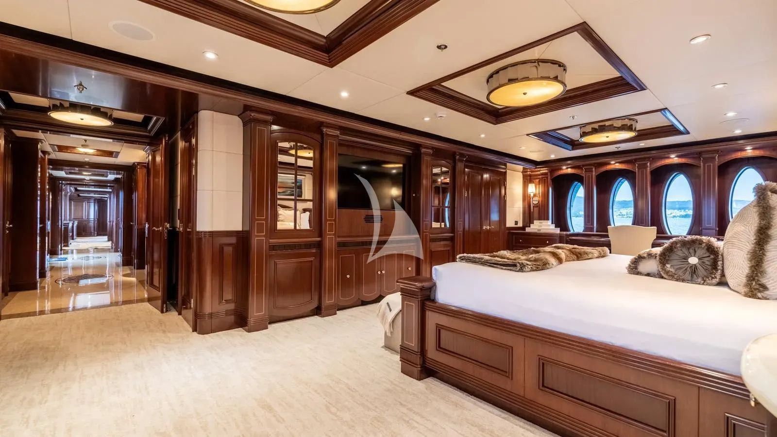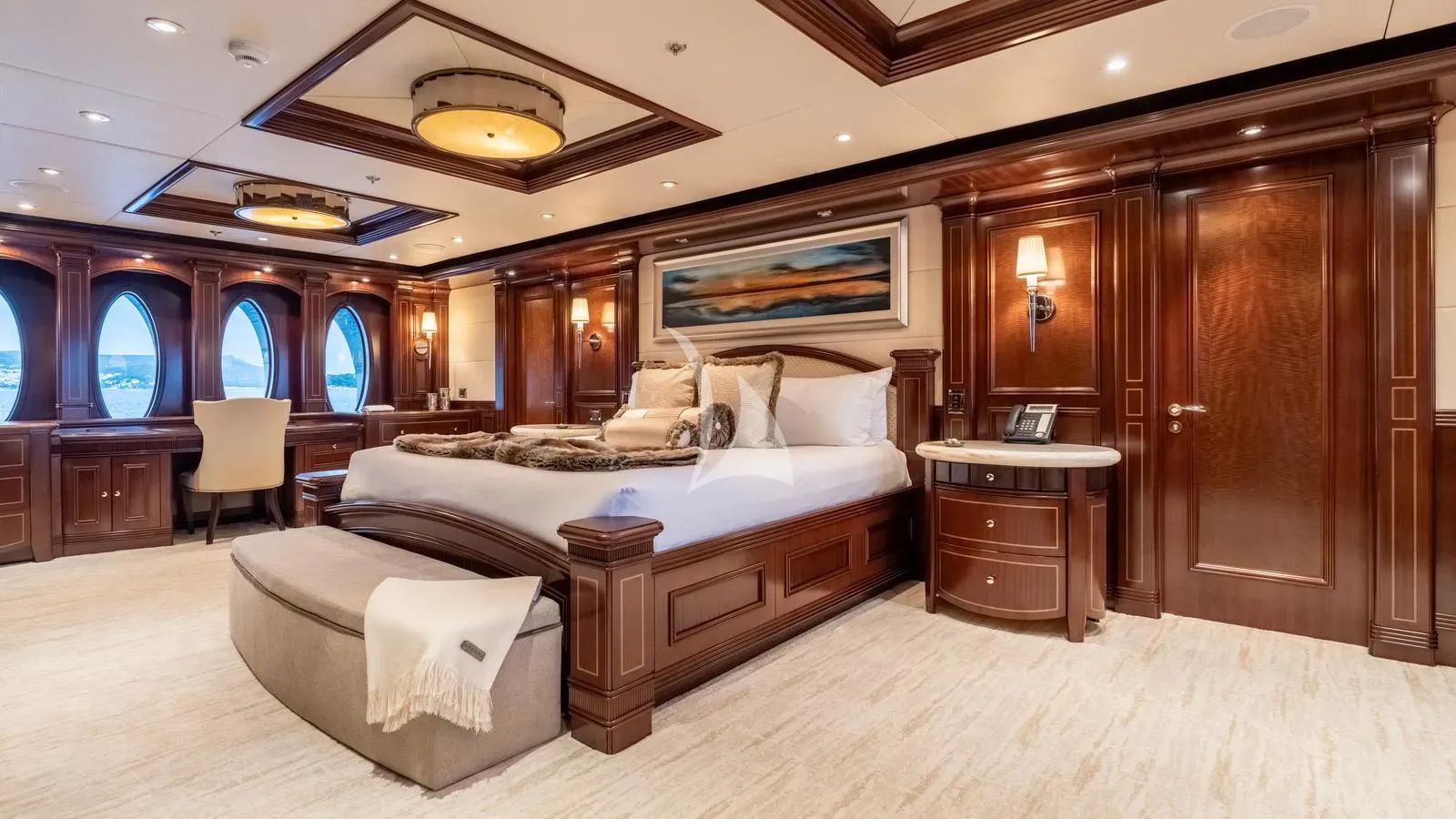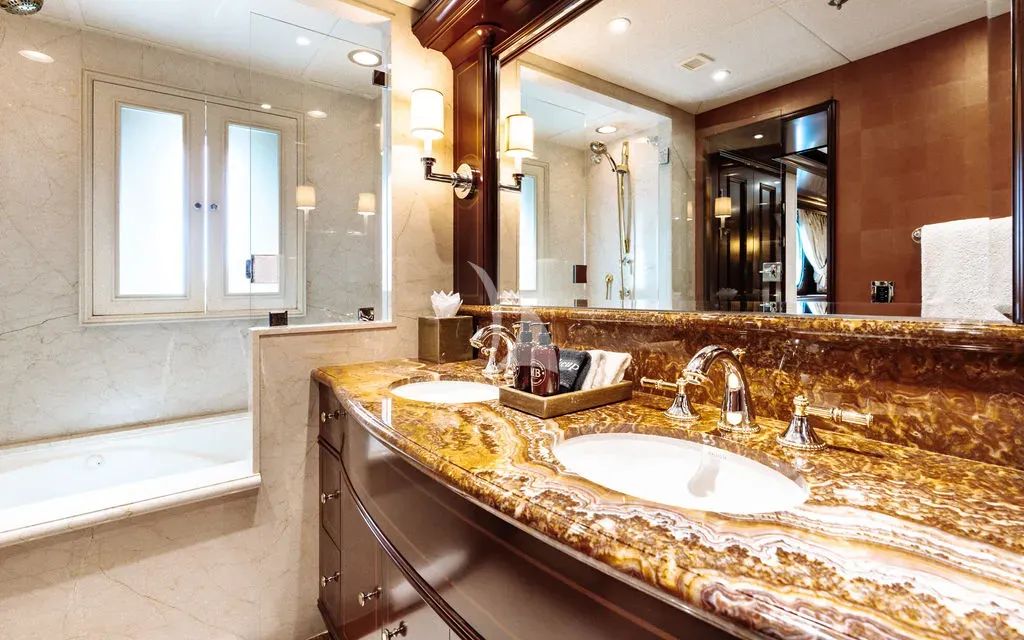 Inside, LADY BETH reveals interiors that feel both radiant and intimate. Wide glass windows bathe the saloon and dining areas in natural light, blending contemporary elegance with subtle warmth. A private elevator connects every deck, ensuring movement is smooth and effortless. The master cabin is a sanctuary of its own, featuring a grand king bed, a dedicated vanity, a spacious walk-in closet, and a refined marble bathroom complete with a deep bathtub for unhurried evenings at sea. Each of her six ensuite staterooms reflects the same commitment to comfort and tranquility, offering a place where every guest feels entirely at home.