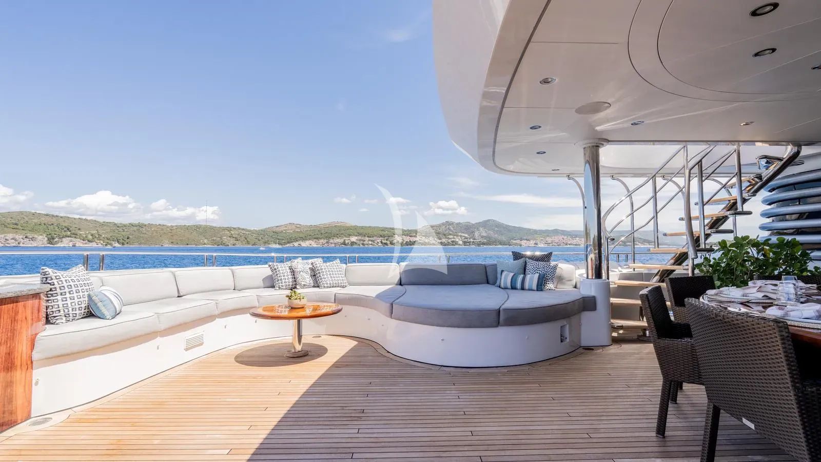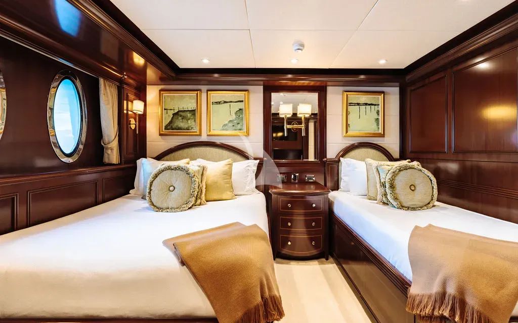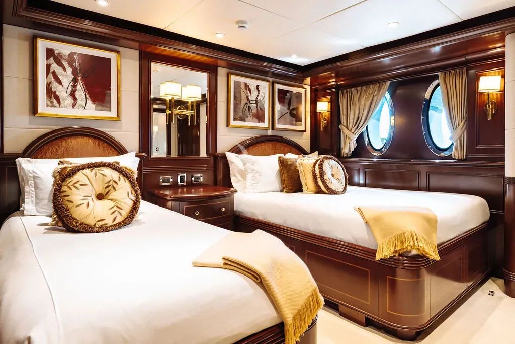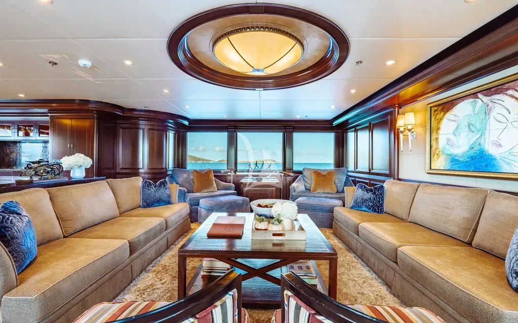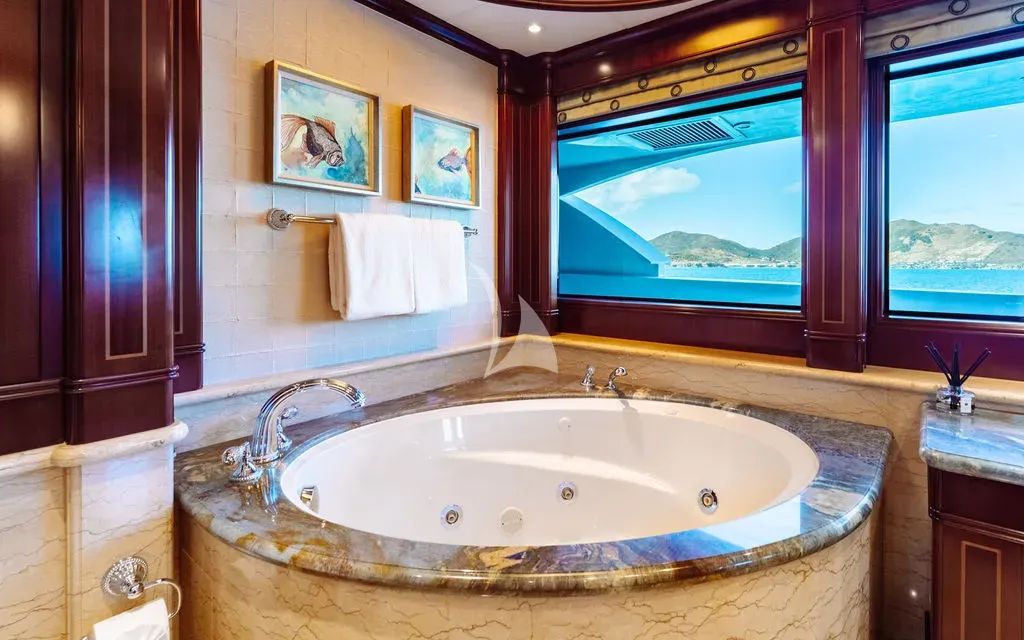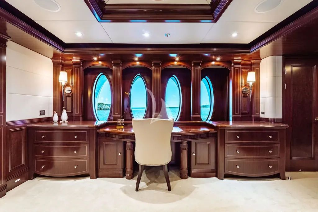 Inside, LADY BETH reveals interiors that feel both radiant and intimate. Wide glass windows bathe the saloon and dining areas in natural light, blending contemporary elegance with subtle warmth. A private elevator connects every deck, ensuring movement is smooth and effortless. The master cabin is a sanctuary of its own, featuring a grand king bed, a dedicated vanity, a spacious walk-in closet, and a refined marble bathroom complete with a deep bathtub for unhurried evenings at sea. Each of her six ensuite staterooms reflects the same commitment to comfort and tranquility, offering a place where every guest feels entirely at home.
