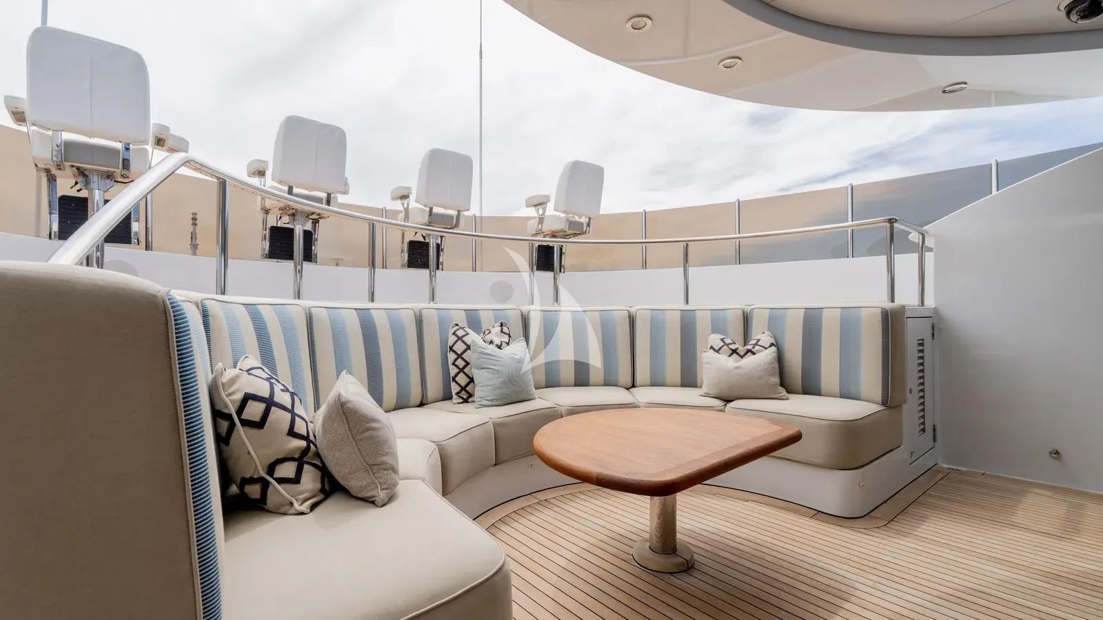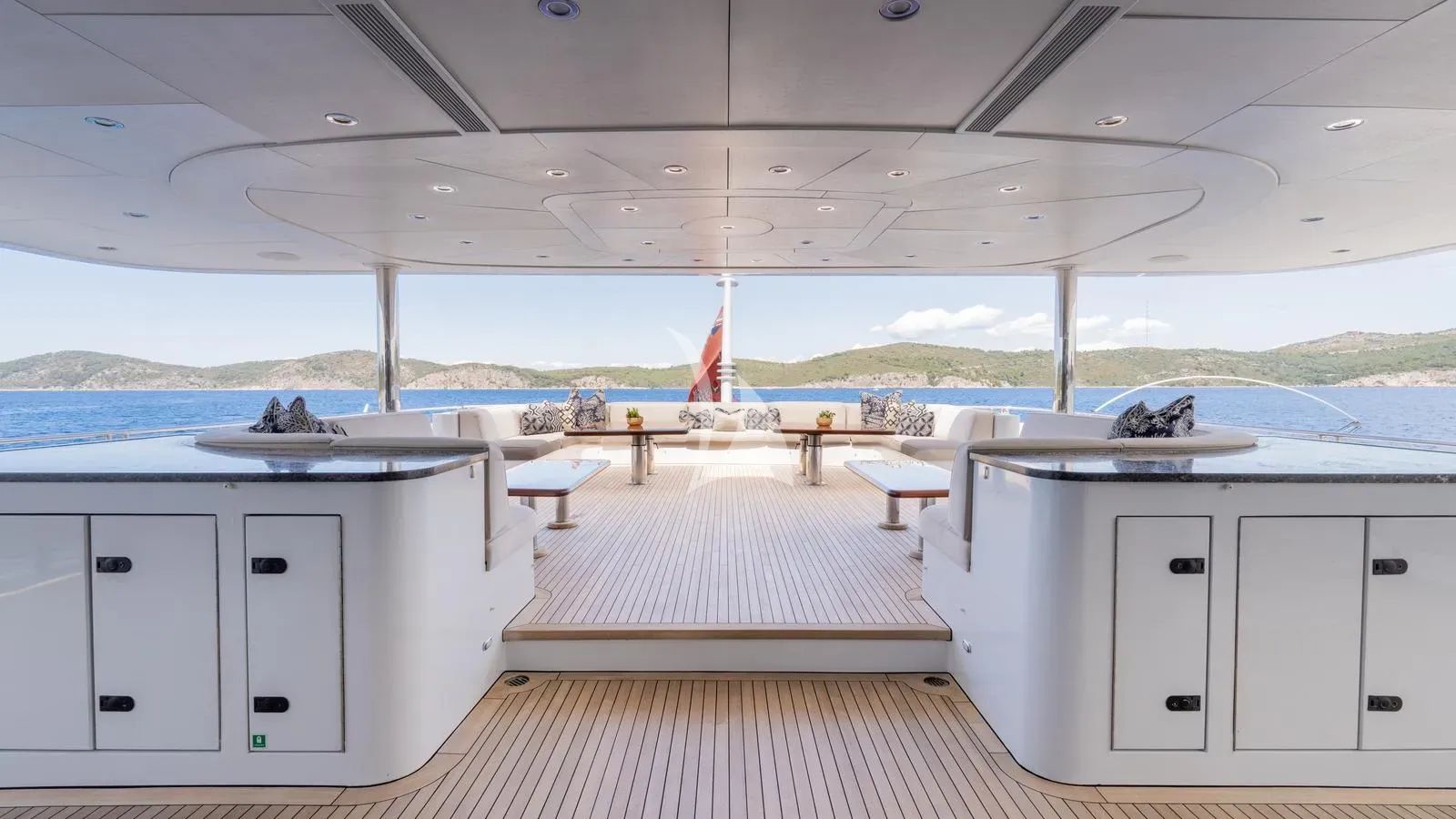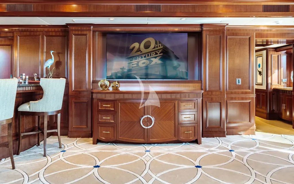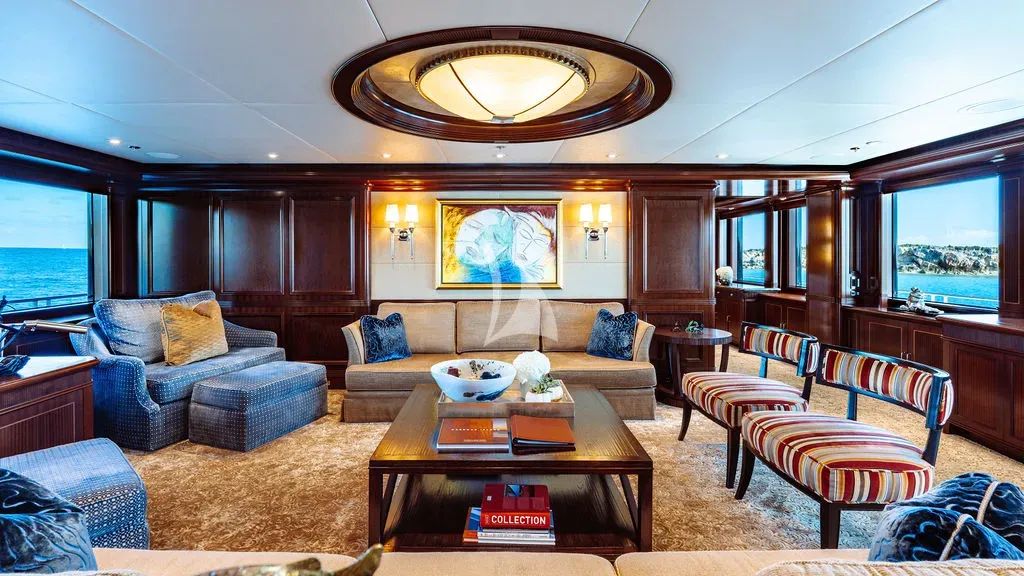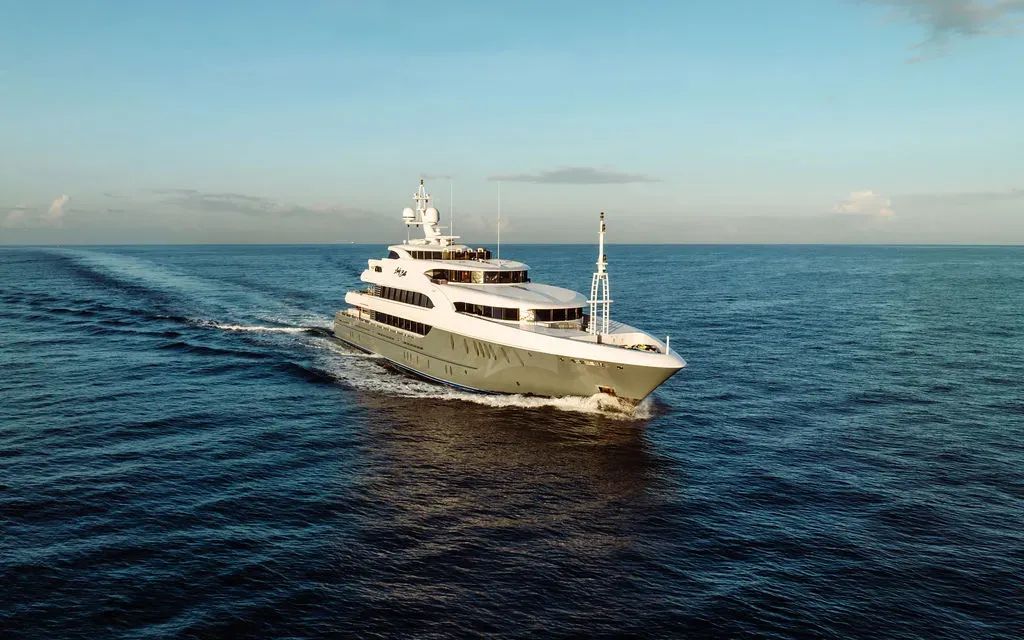Inside, LADY BETH reveals interiors that feel both radiant and intimate. Wide glass windows bathe the saloon and dining areas in natural light, blending contemporary elegance with subtle warmth. A private elevator connects every deck, ensuring movement is smooth and effortless. The master cabin is a sanctuary of its own, featuring a grand king bed, a dedicated vanity, a spacious walk-in closet, and a refined marble bathroom complete with a deep bathtub for unhurried evenings at sea. Each of her six ensuite staterooms reflects the same commitment to comfort and tranquility, offering a place where every guest feels entirely at home.