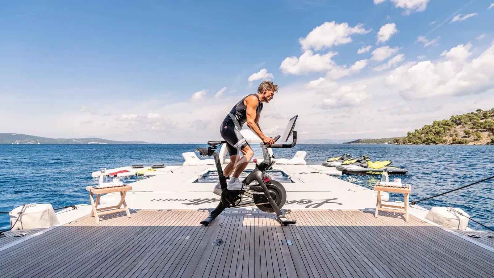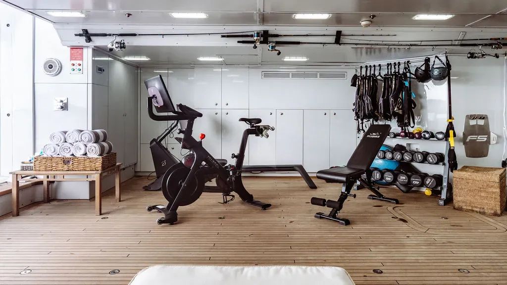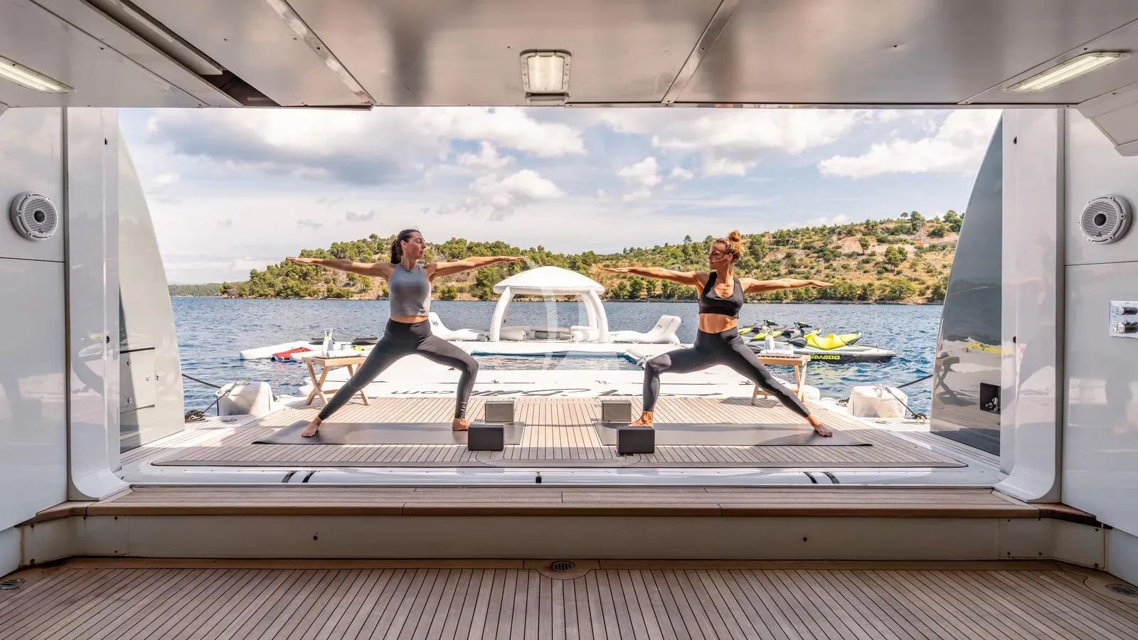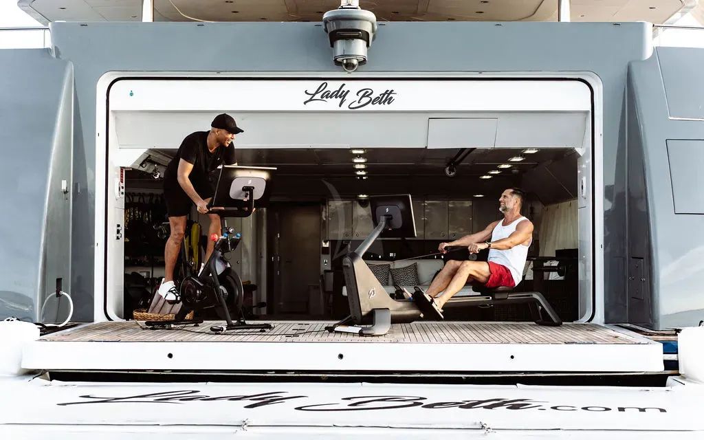 Wellness finds its rhythm aboard LADY BETH. Her fully equipped gym invites sunrise workouts overlooking the sea, while the serene spa room provides a retreat for massage or meditation. When the afternoon heat rises, guests drift toward the beach club, a calm, teak-lined haven leading to the hydraulic swim platform and the glass-clear sea beyond. Here, the water comes alive with coral, color, and the quiet hum of adventure waiting beneath the surface.