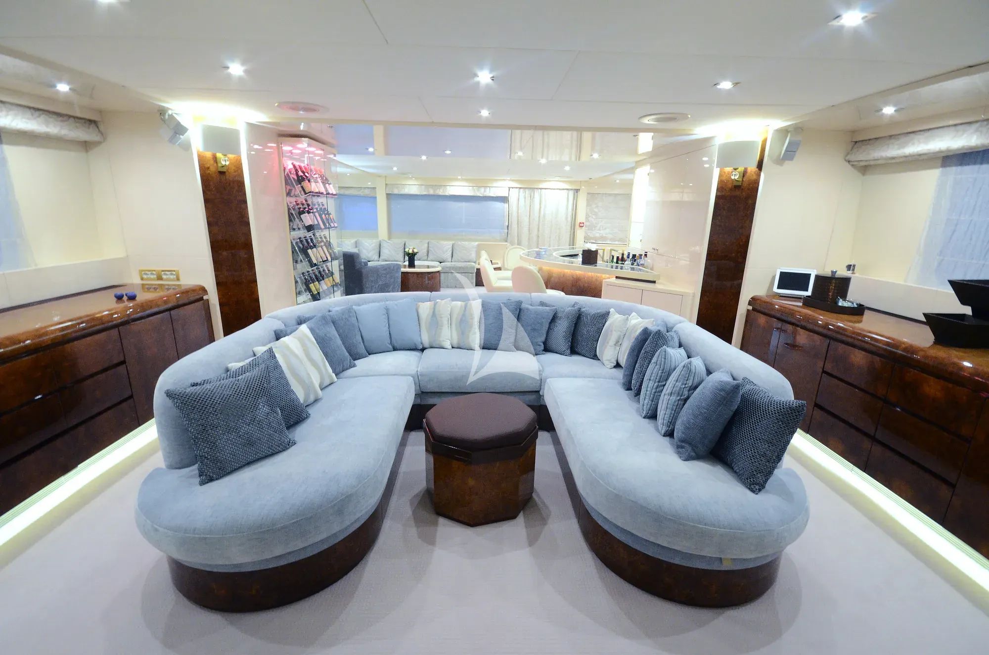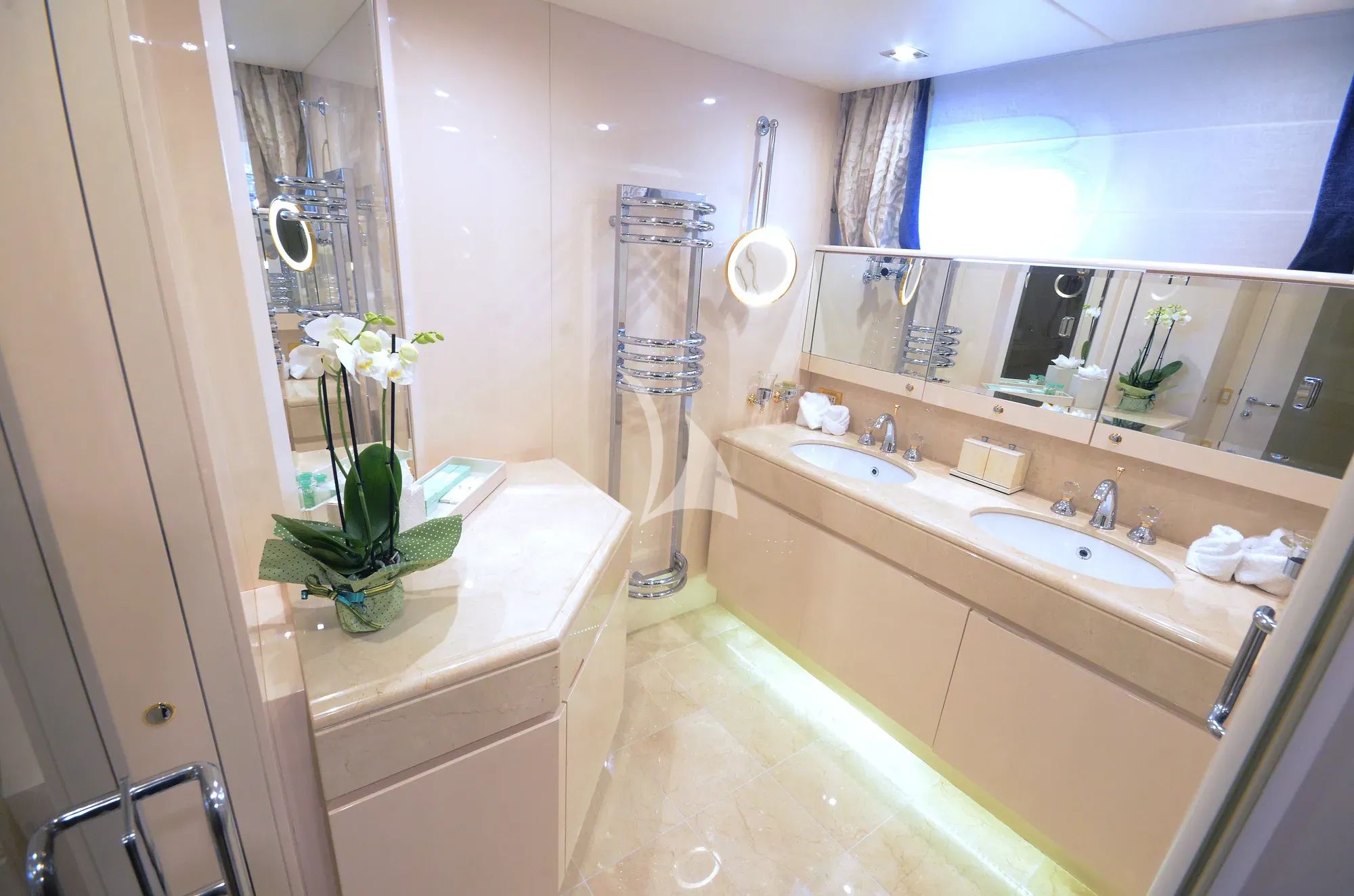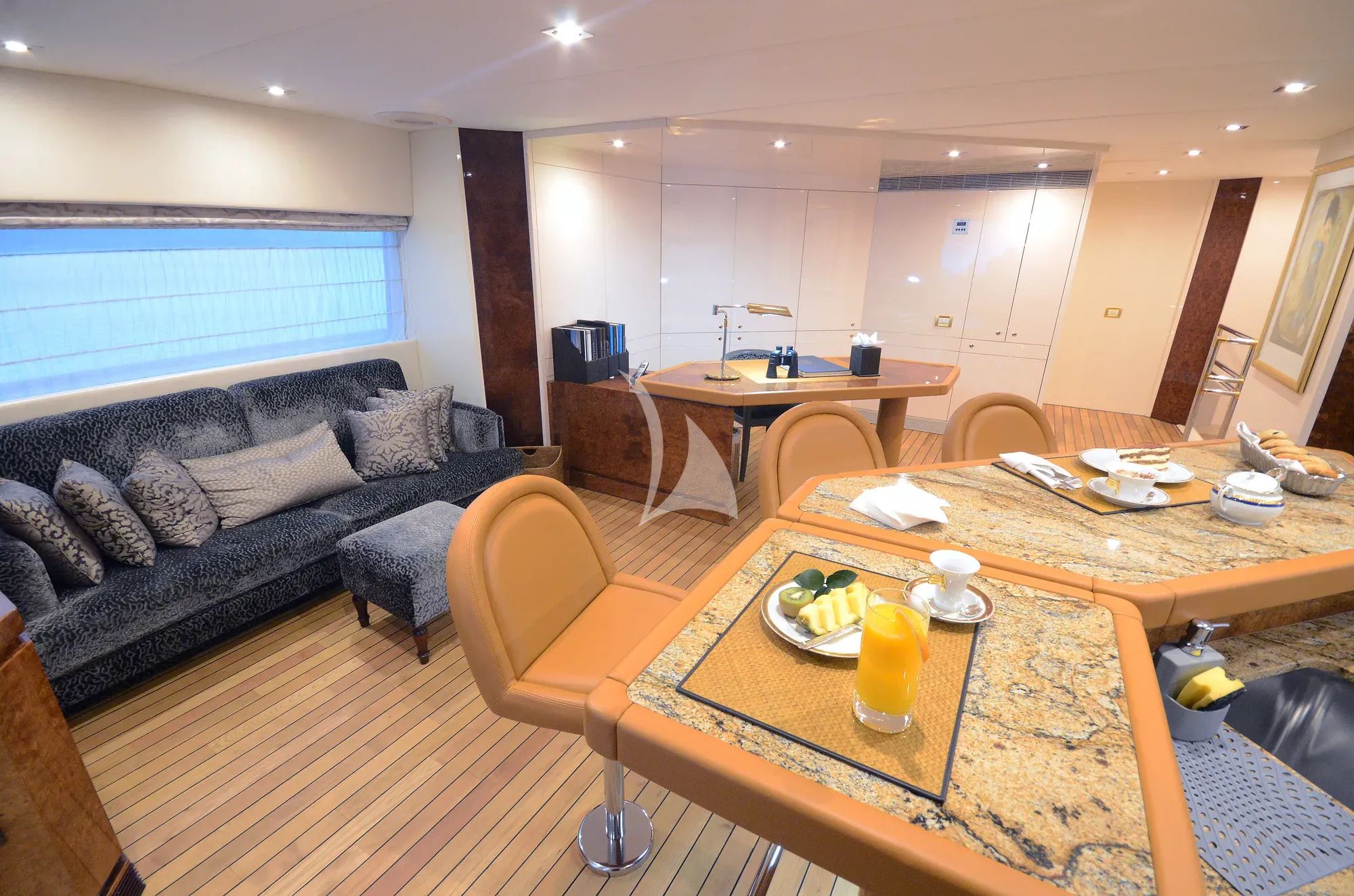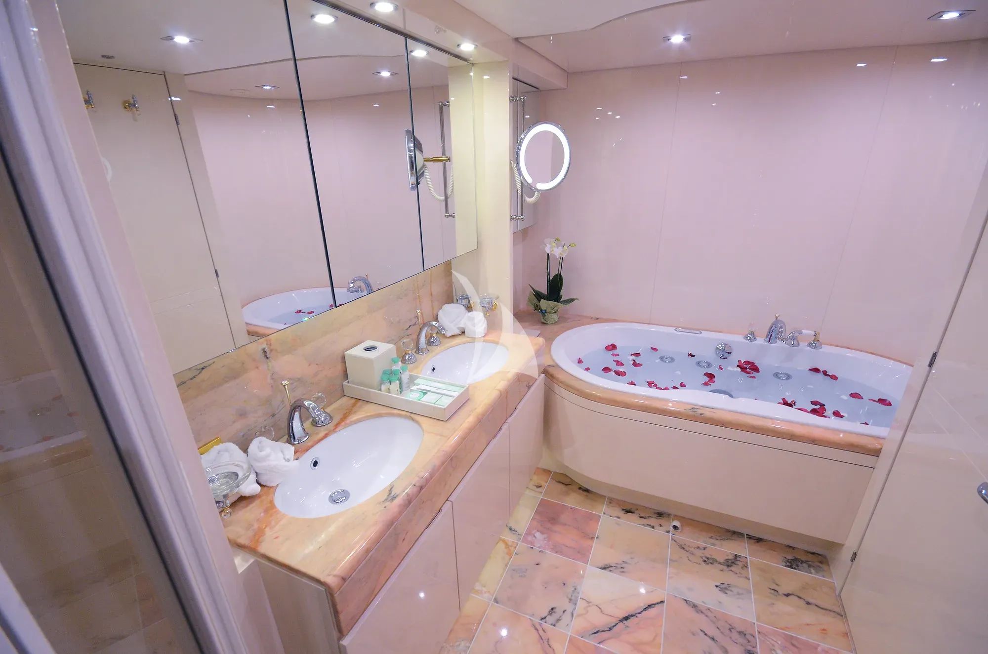 Her interior unfolds with a polished charm that balances modern aesthetics and inviting warmth. Sunlight fills the saloon and dining areas through broad windows, enhancing the open layout. Each cabin is designed with its own ensuite, giving guests privacy and comfort throughout the charter. The master cabin, featuring a queen bed, LED TV, and bathtub-equipped ensuite, becomes an intimate retreat for those quiet end-of-day moments.