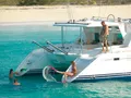 The Lagoon 440 was voted Best Charter Catamaran 2005 by Cruising World and we are pleased to offer this fabulous yacht to our guests.Boarding the yacht form the transom, guests step into the lounge-like, aft deck cockpit area which features a semi u-shaped bench seating arrangement. A fixed solid bimini provides cover for this area and a wet bar located before the saloon entrance is a great facility for on-deck living. The forward seating area by the trampoline provides additional space for sunbathing and relaxing.