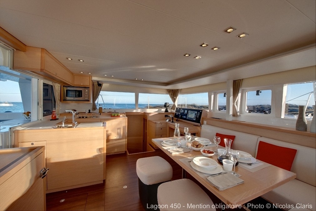 This Lagoon 450 bareboat catamaran, accommodating up to 8 guests in 4 double cabins, is ideal for sailing holidays around Mallorca.This amazing catamaran really is in a class of her own, she is incredibly elegant and spacious, yet easy to maneuver through a single joystick.