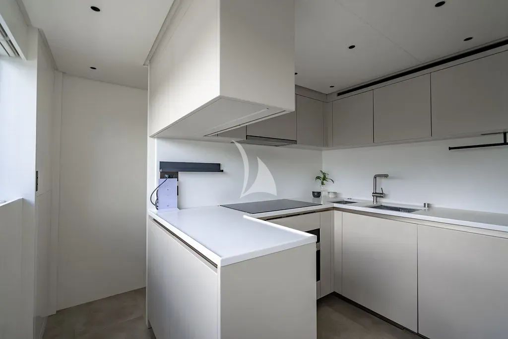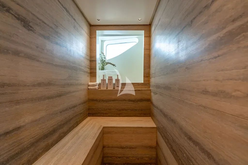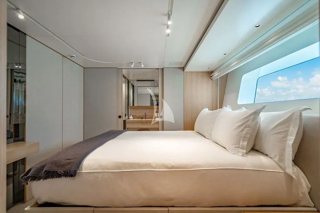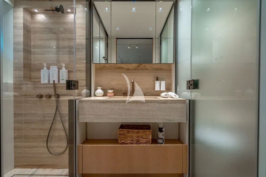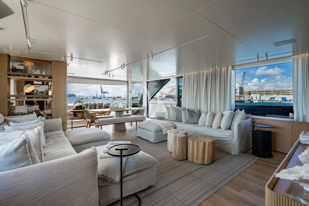 Inside, the atmosphere shifts to contemporary elegance, with glass fixtures and accent lighting adding depth and character to the interior. Natural light fills the yacht through expansive windows, enhancing the saloon and dining area as a welcoming setting for celebrations and shared meals. Accommodation includes refined cabins with private bathrooms, while the master cabin offers a king bed, walk-in closet, and marble bathroom designed for comfort and privacy.
