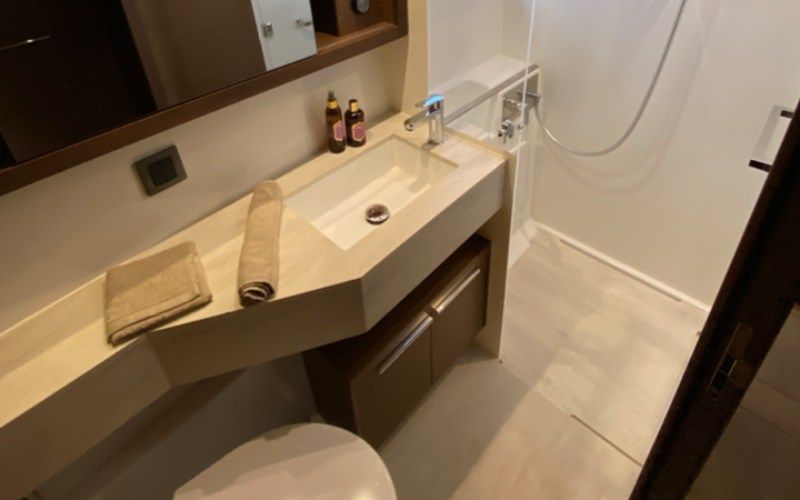 Inside, everything feels open, bright, and connected to the outside, with panoramic windows bringing in generous light and keeping the view part of the room. The saloon lounge and dining area quickly becomes the social heart of the yacht, made for easy breakfasts, shared bites, and dinners that naturally run late. Three double cabins, a fully equipped galley, and generous lounging spaces make longer charters feel simple for families and friend groups, offering comfort without complication. The layout knows when to feel lively and when to feel private, which is exactly what makes time onboard so enjoyable.