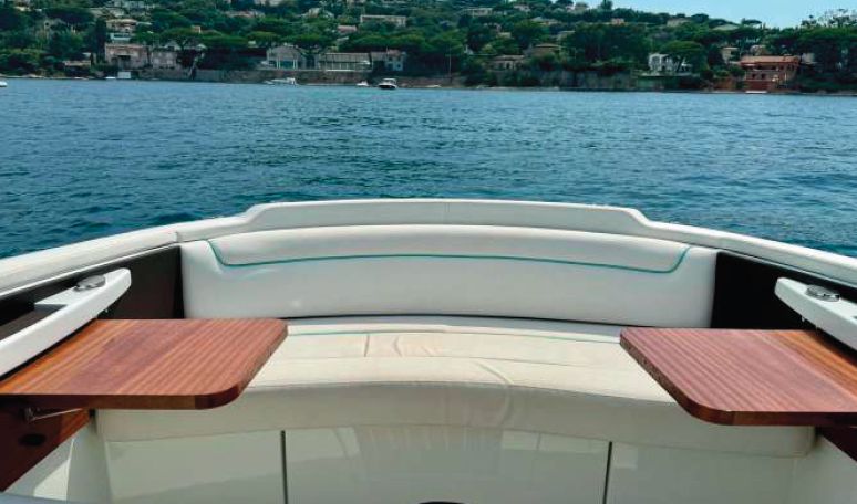 Her layout is made for a day that shifts naturally between social enjoyment and quiet relaxation. The upper deck welcomes guests into an open lounge setting beneath the Riviera sky, perfect for drinks, conversation, and laid-back moments together, with a bimini available when a little shade is needed. Forward, the foredeck offers a calmer escape for sunbathing, stretching out, or simply taking in the passing coastal views. Below, her interior feels refined and easy to settle into, with modern lines, soft finishes, and a cabin ready for quick rest stops when you want a peaceful break from the sun.