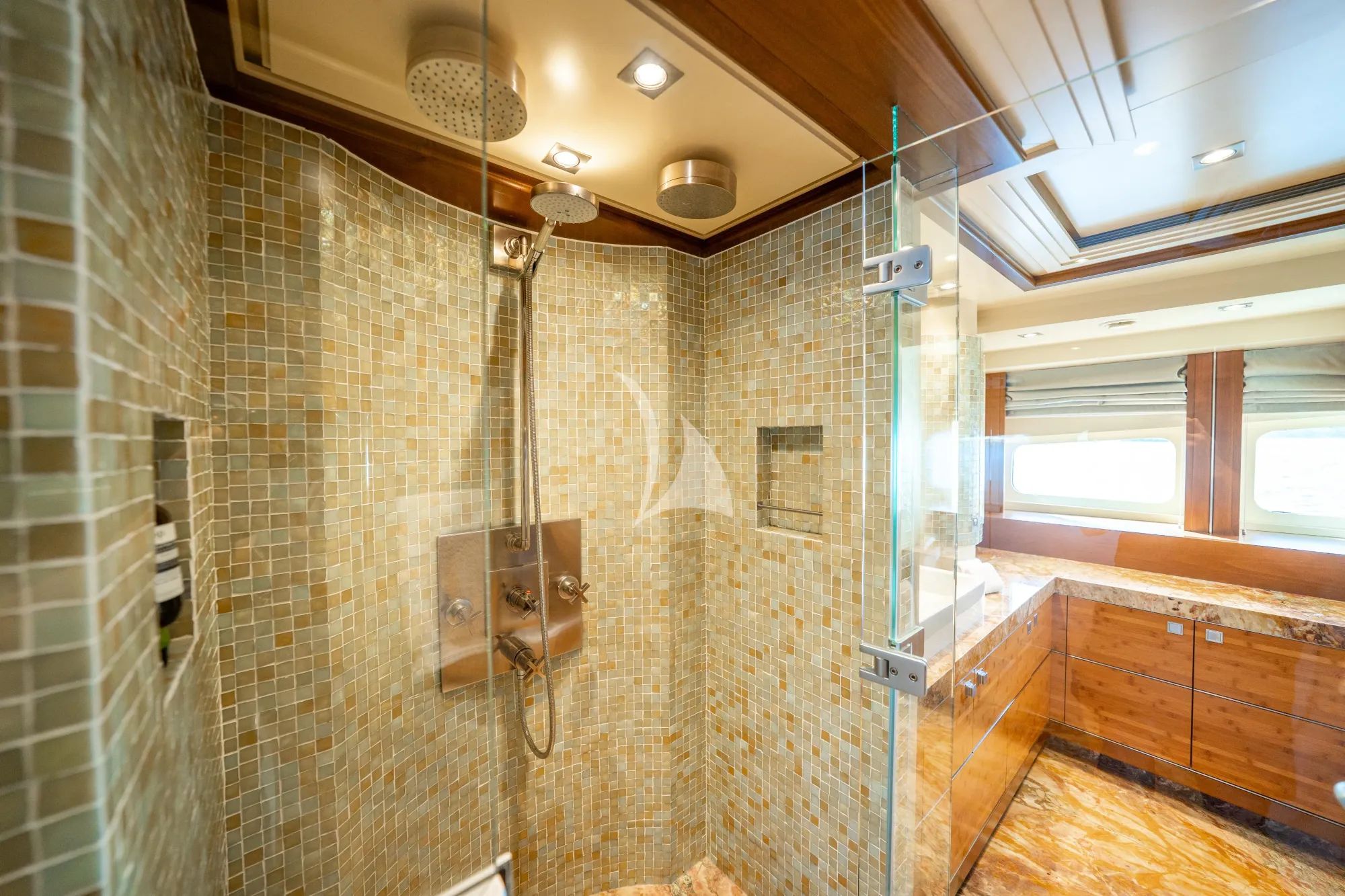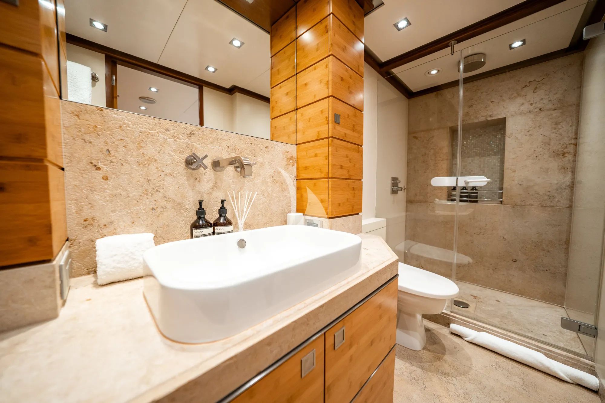 Inside, LUMIR reveals a calm and elegant interior that balances modern styling with warm teak accents. The main salon features plush seating, a formal dining area, and a full-sized poker table that encourages relaxed evenings on board. Accommodation welcomes up to ten guests across five well-appointed cabins, including a full beam master suite, two VIP cabins, and a twin cabin with bunks, each with private ensuite facilities to ensure comfort and privacy throughout the charter.