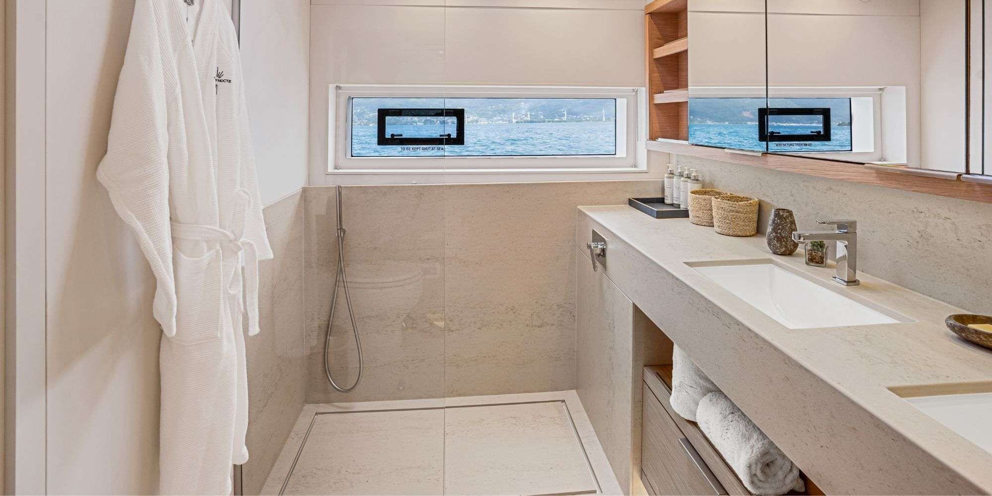 When you step onboard, you will be greeted by a luxurious and spacious interior. The radiant saloon and indoor dining area make for the perfect setting to host an unforgettable party. The posh cabins come equipped with private bathrooms and are adorned with teak designs and creamy brown accents, providing an overall premium feel. Your stay on MANE ET NOCTE promises to be truly remarkable, with ultimate comfort and relaxation for everyone onboard.