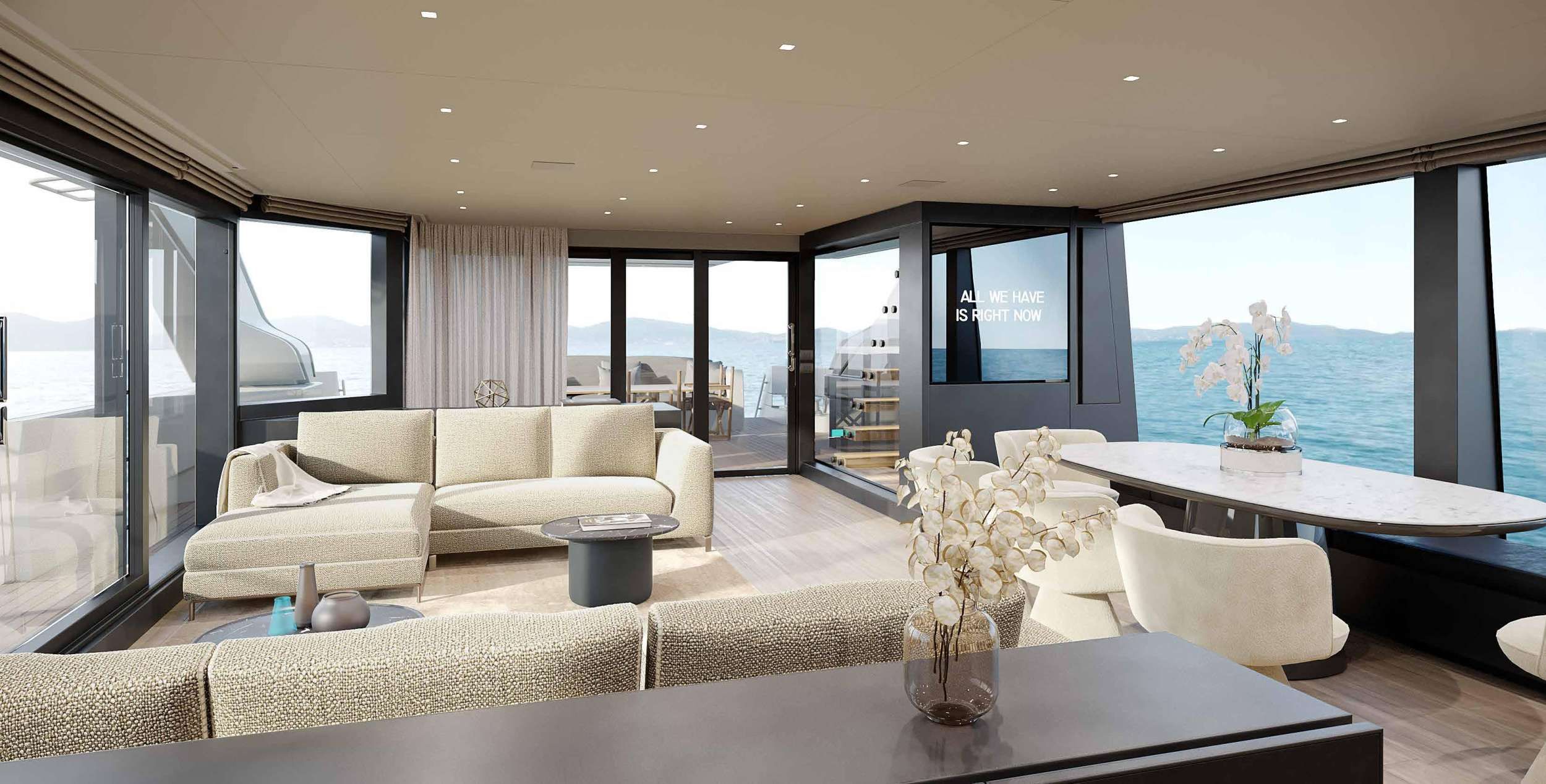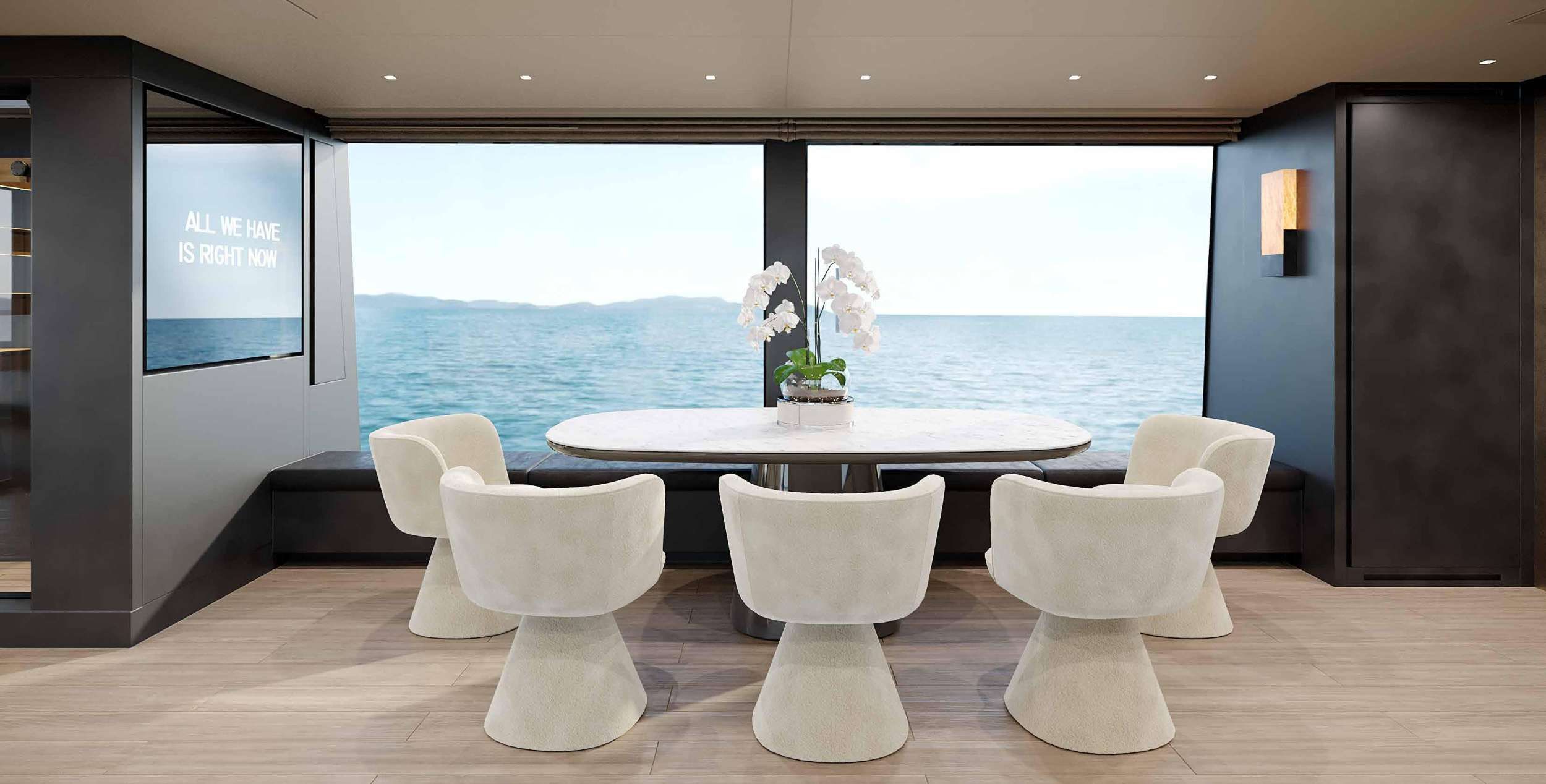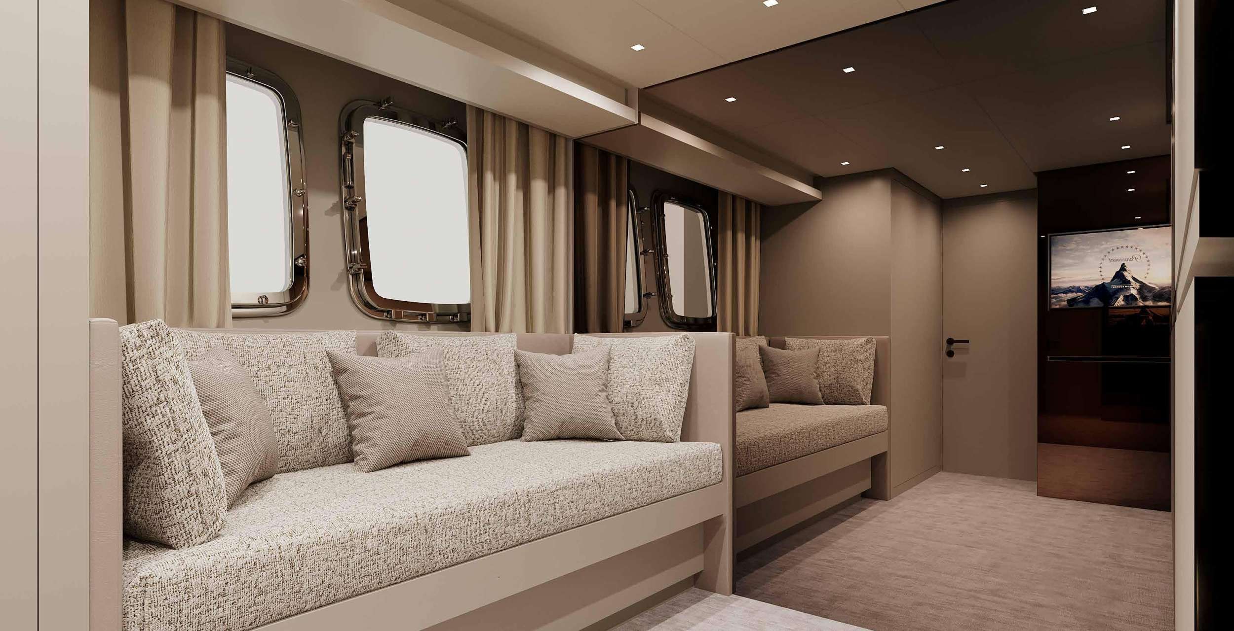 Within the yacht, modern Italian design defines the interior with understated refinement. Natural light pours through expansive glass windows, creating a warm and open atmosphere across social areas and cabins. Each ensuite stateroom offers privacy and comfort, ensuring restful nights that prepare guests for active days on the water.
