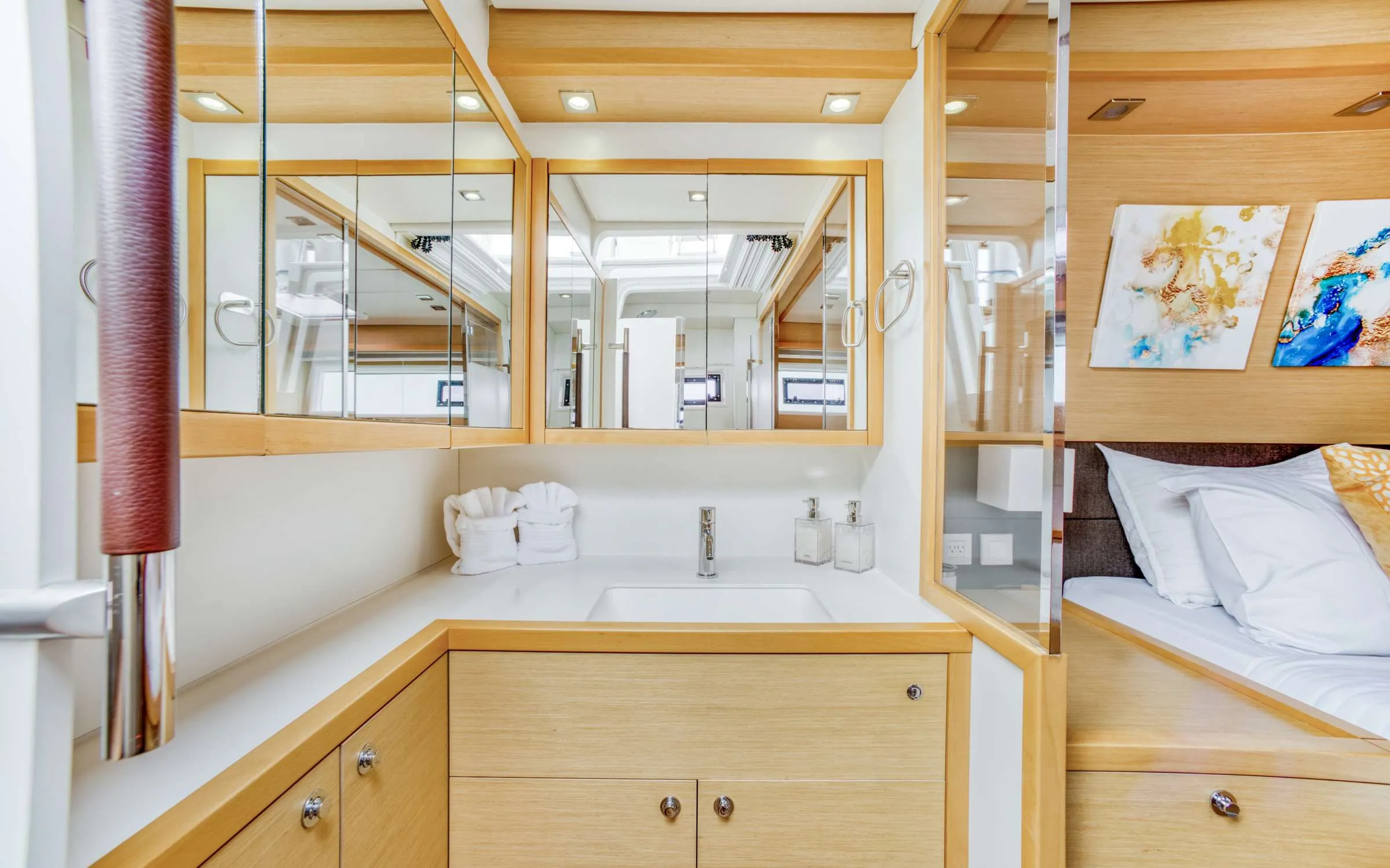 Her expansive foredeck is made for midday naps or soaking up the sun with a cold drink in hand. Her covered flybridge creates the perfect space to indulge in evening drinks with loved ones as the sun casts its final rays into the evening sky.