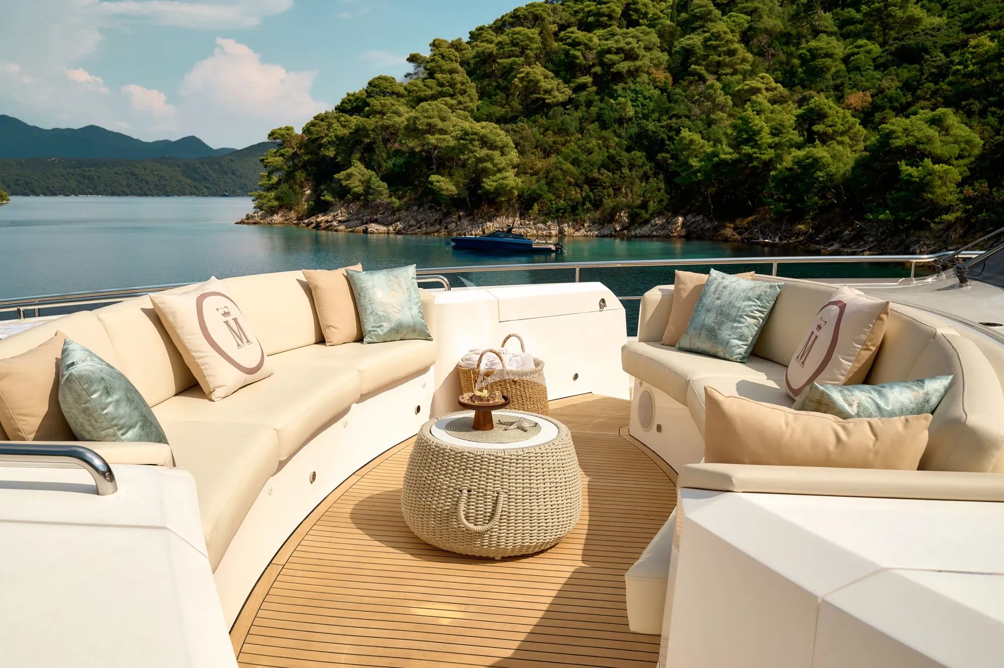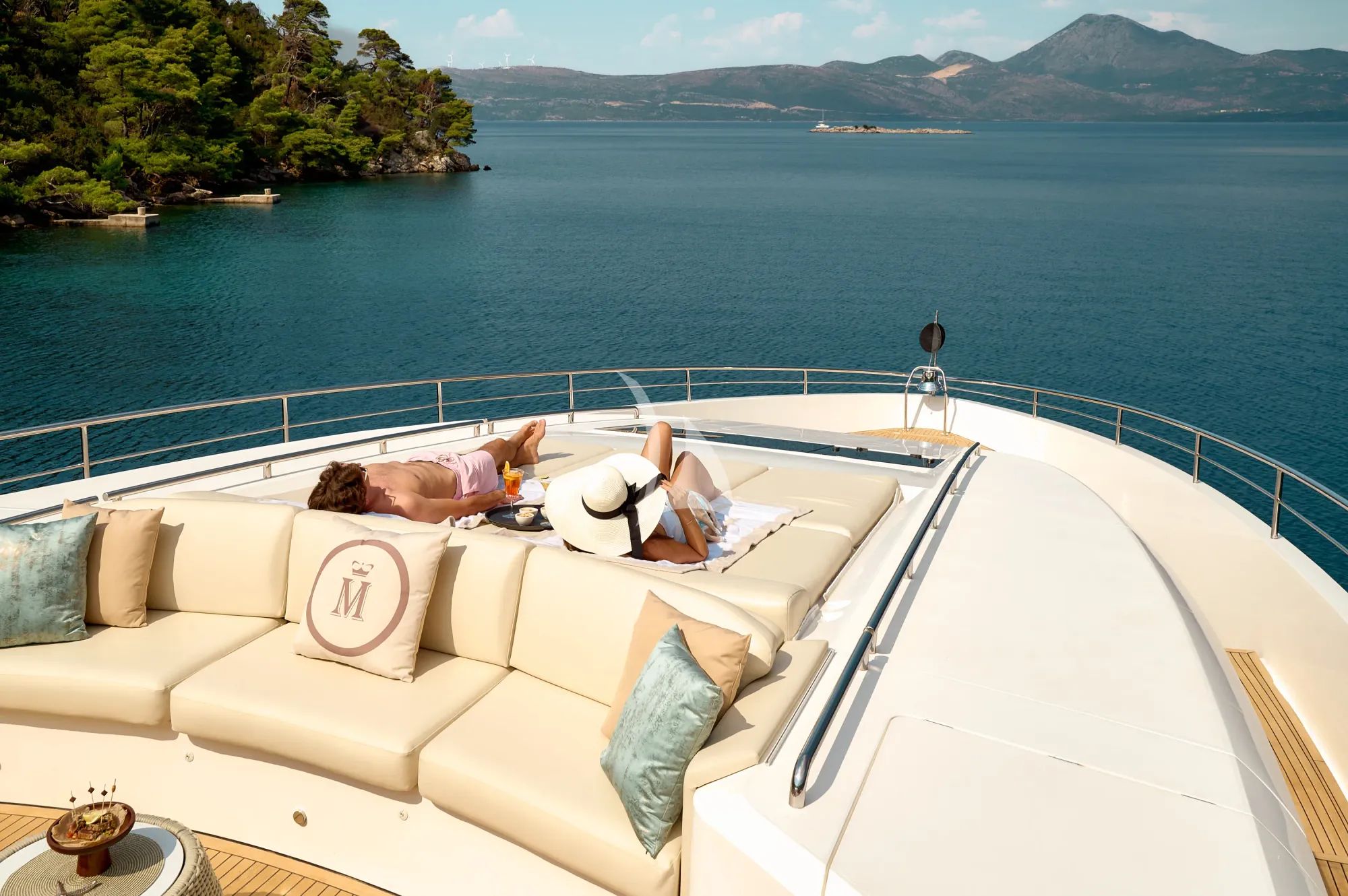 A key feature of MIRAGE IV is her spacious sun deck, which presents a stunning panoramic view of Brac's unique karst limestone formations. Unwind in the comfortable seating area, perfect for reliving treasured memories with family and friends while sipping on your favorite personalized cocktail blend. Anchor near the historic city of Dubrovnik to relish a sunset alfresco dinner before wandering through its picturesque harbor and old streets. Start your day by sunbathing on the foredeck or main lounging area, soaking in the serene ocean views, then cool down in the jacuzzi to untighten your tensed muscles.