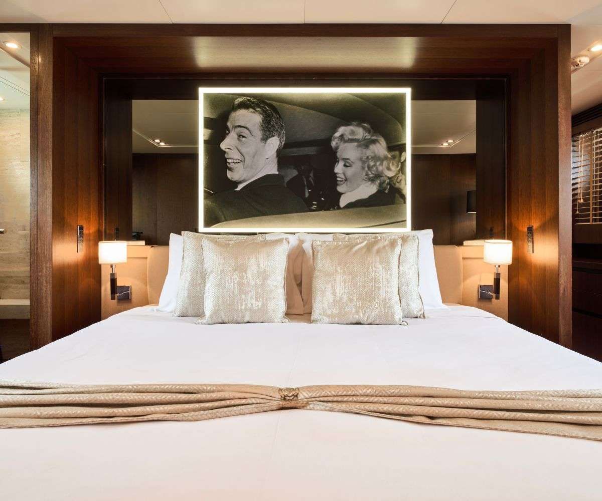 On her spacious flybridge, you can admire the iconic skyline of Athens while enjoying an alfresco dinner paired with a chilled glass of Ouzo. Her outdoor lounges and dining areas are made for sharing laughter and meals against breathtaking views, while the foredeck’s cushioned sunbathing space invites you to bask under the Mediterranean sun. Dock in Mykonos to explore its vintage whitewashed streets before returning on board for an unforgettable meal beneath the stars.