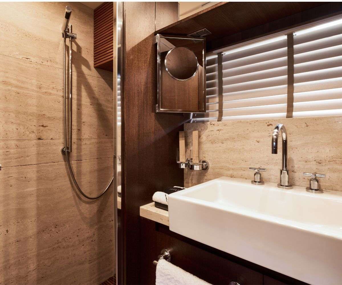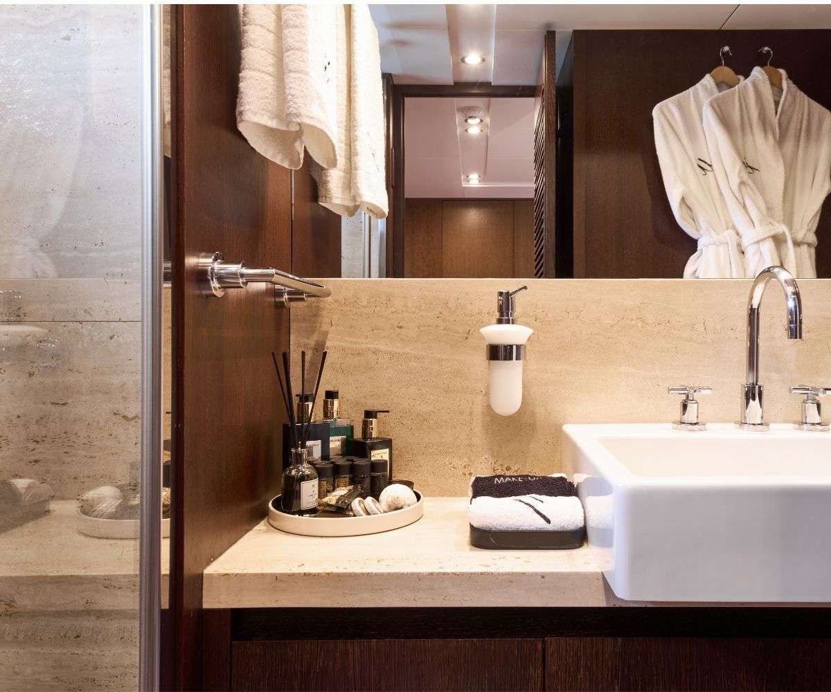 Inside, MIRAVAL reveals interiors that blend traditional teak with contemporary accents, creating a warm and welcoming ambiance. Expansive glass windows flood the saloon with light, making it the perfect setting for intimate gatherings or elegant dining. Below deck, her well-appointed cabins with ensuite bathrooms provide a private sanctuary, ensuring restful nights that reenergize you for another day of Greek adventures.