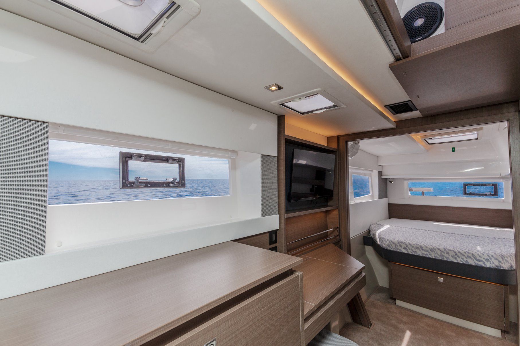 Inside, the saloon and dining area feel bright and welcoming, designed for easy conversation and shared moments. The cabins echo the same modern comfort, with teak finishes and soft tones that help the space feel calm and settled. Each stateroom includes a private ensuite, giving guests their own place to recharge. As night falls, the yacht becomes a quiet retreat, offering a restful end to days spent enjoying the coast.