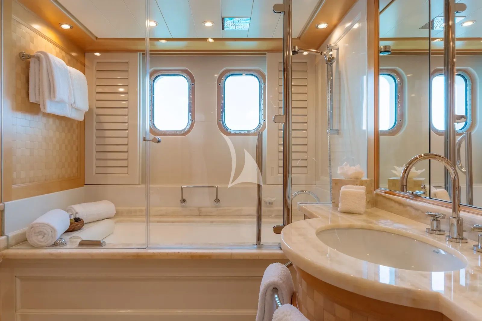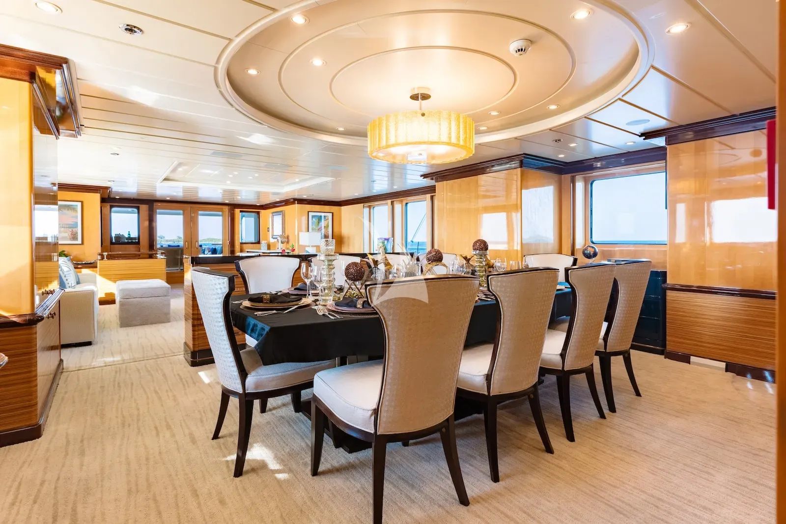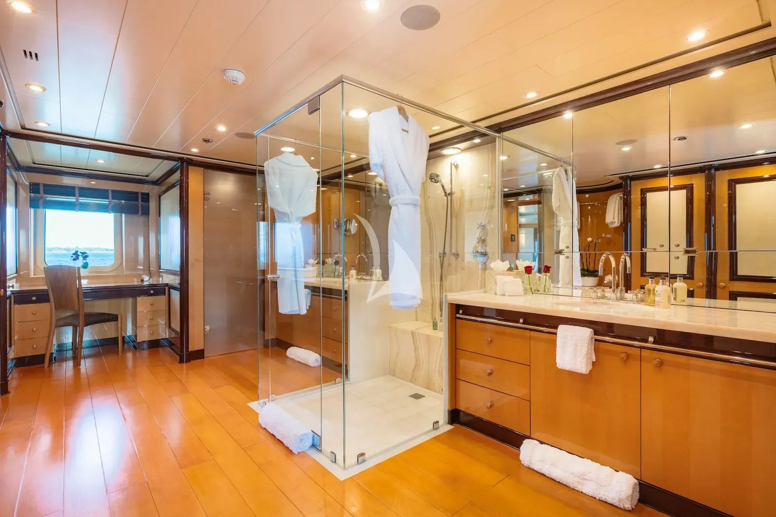 The interior continues that feeling of comfort with spacious living areas and a design style that blends modern lines with a welcoming contemporary warmth. Massive glass windows surround the yacht’s interior spaces, drawing in daylight and enhancing the sense of openness throughout. Each private cabin becomes a retreat in its own right, complete with a luxurious en-suite bathroom and the comfort needed to recharge for the adventures still to come. The master cabin is especially well-appointed, featuring a king bed, TV lounge, office space, dedicated vanity area, and marble en-suite bathroom that give it the feel of a personal residence at sea.