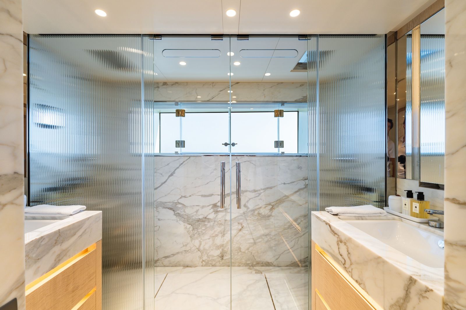 Inside, NOCTURNE welcomes guests into chic interiors where modern Italian flair meets a sense of ease that never feels overstated. Sweeping glass windows fill the main saloon and dining room with natural light, creating a bright and uplifting atmosphere throughout the day. The sky lounge offers another layer to the experience, equally suited to celebrations, a relaxed board game session, or a quiet indoor retreat from the afternoon sun. Accommodation is arranged across five beautiful double cabins, each with its own ensuite bathroom, ensuring comfort and privacy for every guest. The master suite feels especially well considered, with a spacious lounge, a king-size bed, a marble-finished bath, and a big-screen LED TV that turns an evening in into something genuinely appealing.