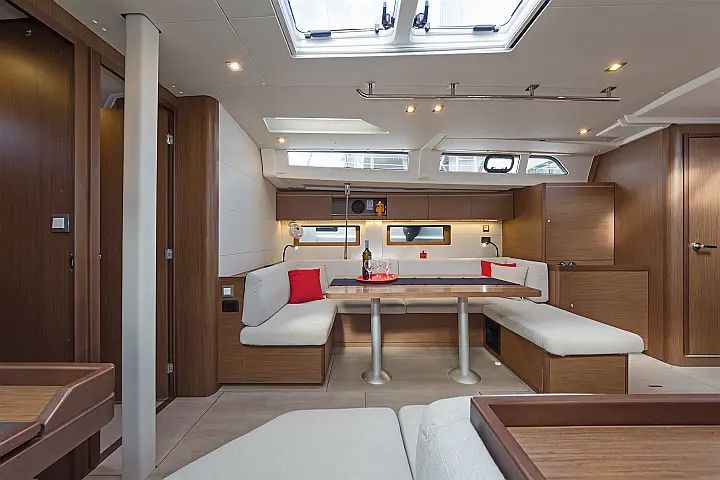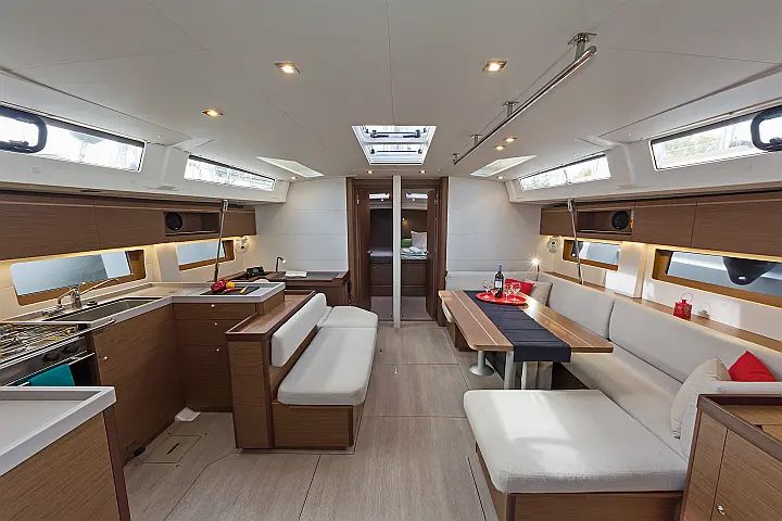 Step below deck, and the sense of space continues. A bright saloon welcomes you with wide windows, a fully equipped galley, and a comfortable dining area where everyone can gather after a day in the water. The layout features five cabins, including four doubles and one twin, giving families and groups the privacy and comfort needed for longer itineraries. Whether you are preparing meals on board, sharing stories over sunset drinks, or resting up for another day of exploring, the Oceanis 51.1 creates a smooth rhythm that fits the relaxed energy of the Dodecanese.
