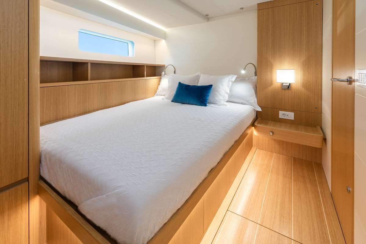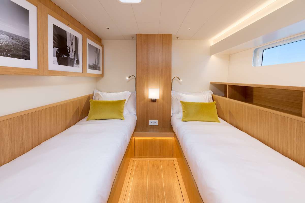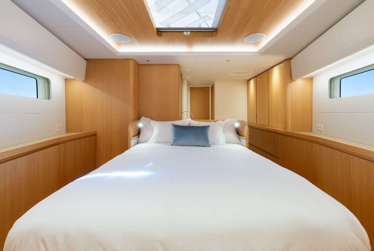 OPTIMIST's interior welcomes you with a blend of light, texture, and contemporary design. Her open saloon features plush seating, a refined dining area, and entertainment spaces perfect for unwinding after a day on the water. The yacht’s cabins offer peaceful sanctuaries, each fitted with ensuite bathrooms and thoughtful details that make every guest feel at home.