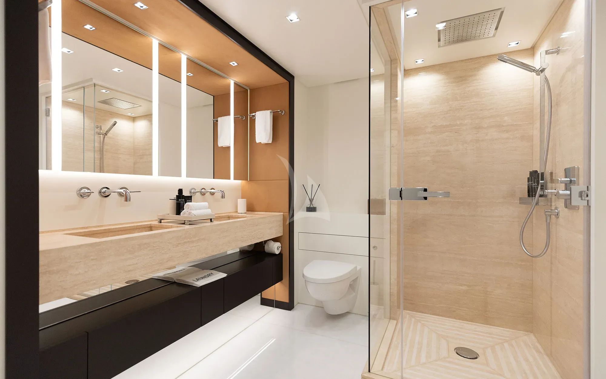 Inside, ORION welcomes guests into a bright and contemporary interior highlighted by glass accents and carefully planned lighting. The saloon, dining area, and galley benefit from floor-to-ceiling windows that maintain a strong visual connection to the sea. Guest cabins continue this sense of calm, each featuring a private ensuite and a layout designed for comfort and privacy.