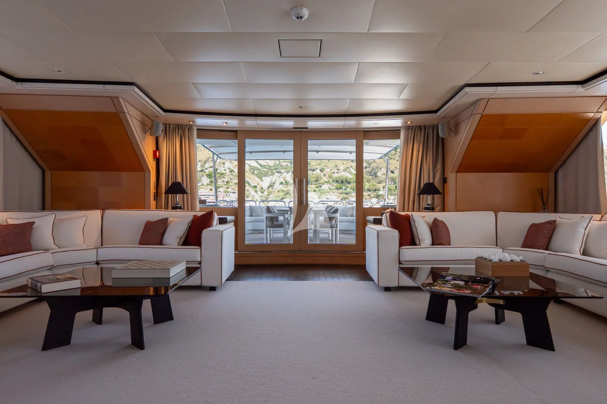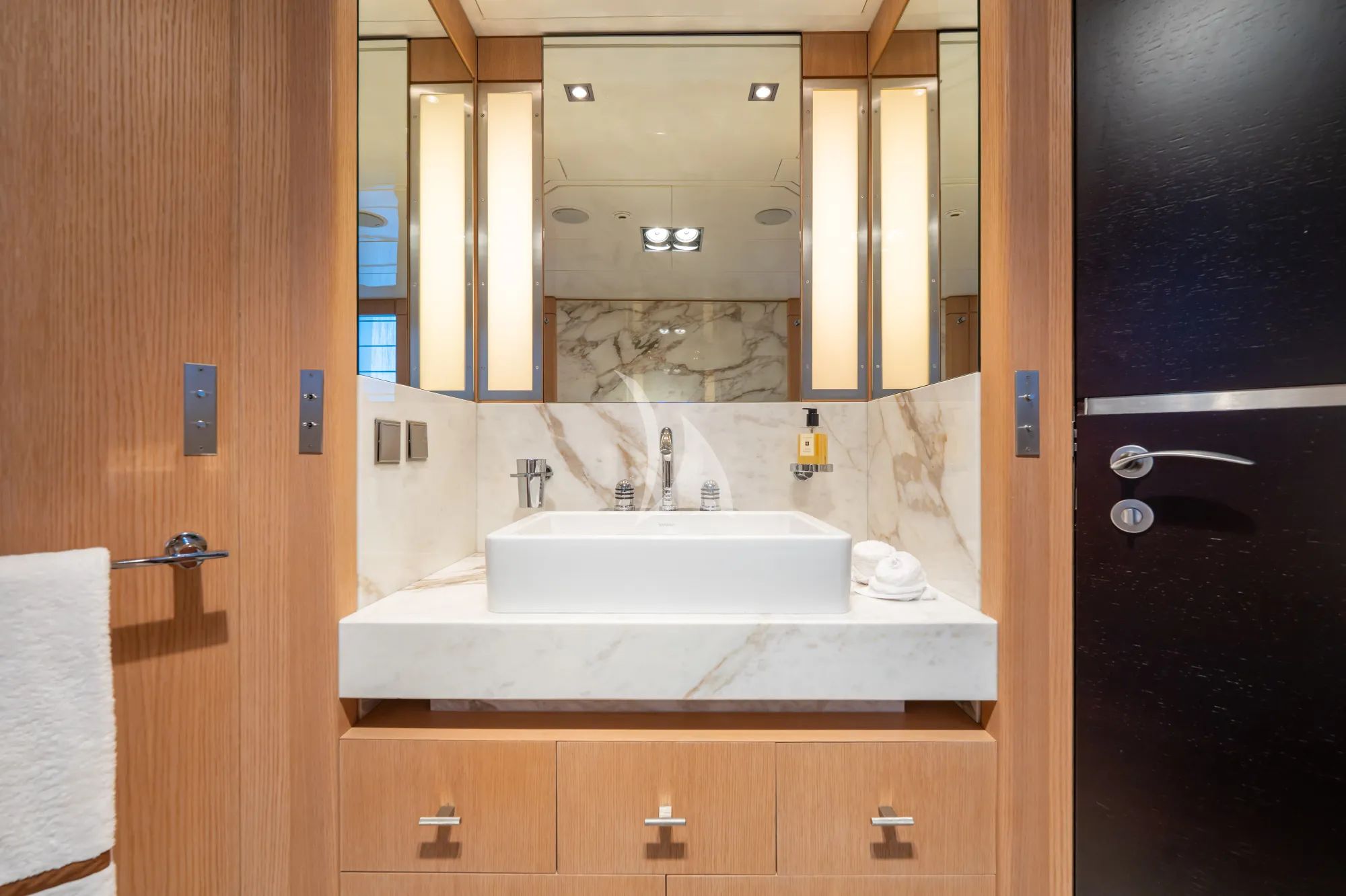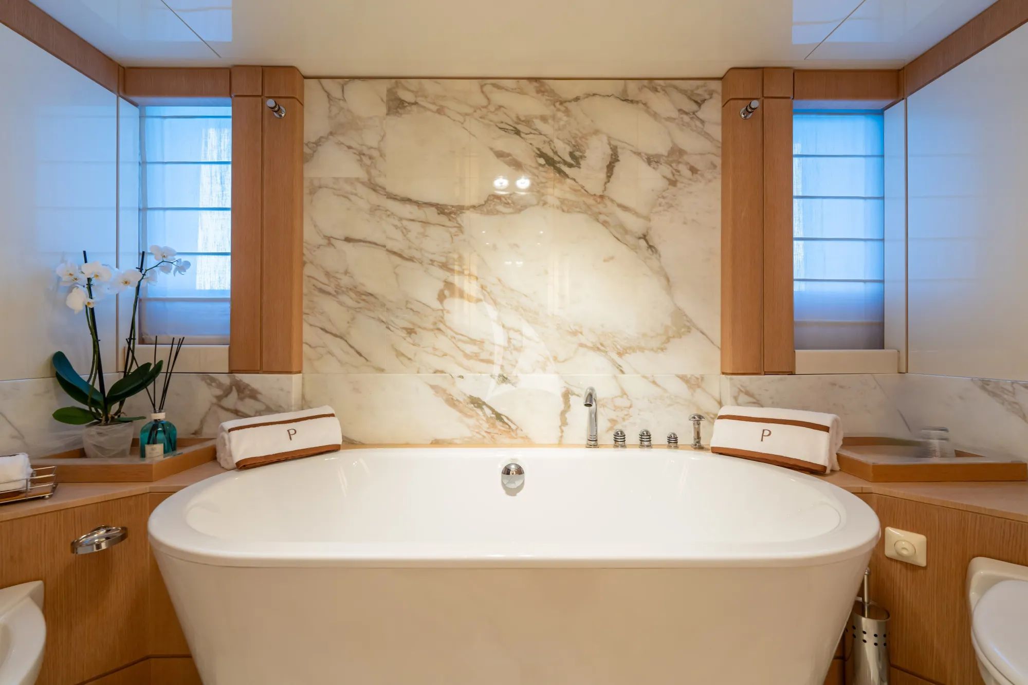 Her interiors are a blend of elegance and modern design, with floor-to-ceiling glass windows bathing the saloon and sky lounge in natural light. These social hubs are crafted for both lively evenings and tranquil retreats, offering comfortable seating, refined dining areas, and contemporary décor. At night, retreat to your private suite, where ensuite cabins promise both privacy and indulgence. The master cabin stands as a sanctuary with a king-size bed, private office space, large LED TV, and a spa-inspired ensuite complete with a bathtub, offering guests a serene escape after a day of adventure.