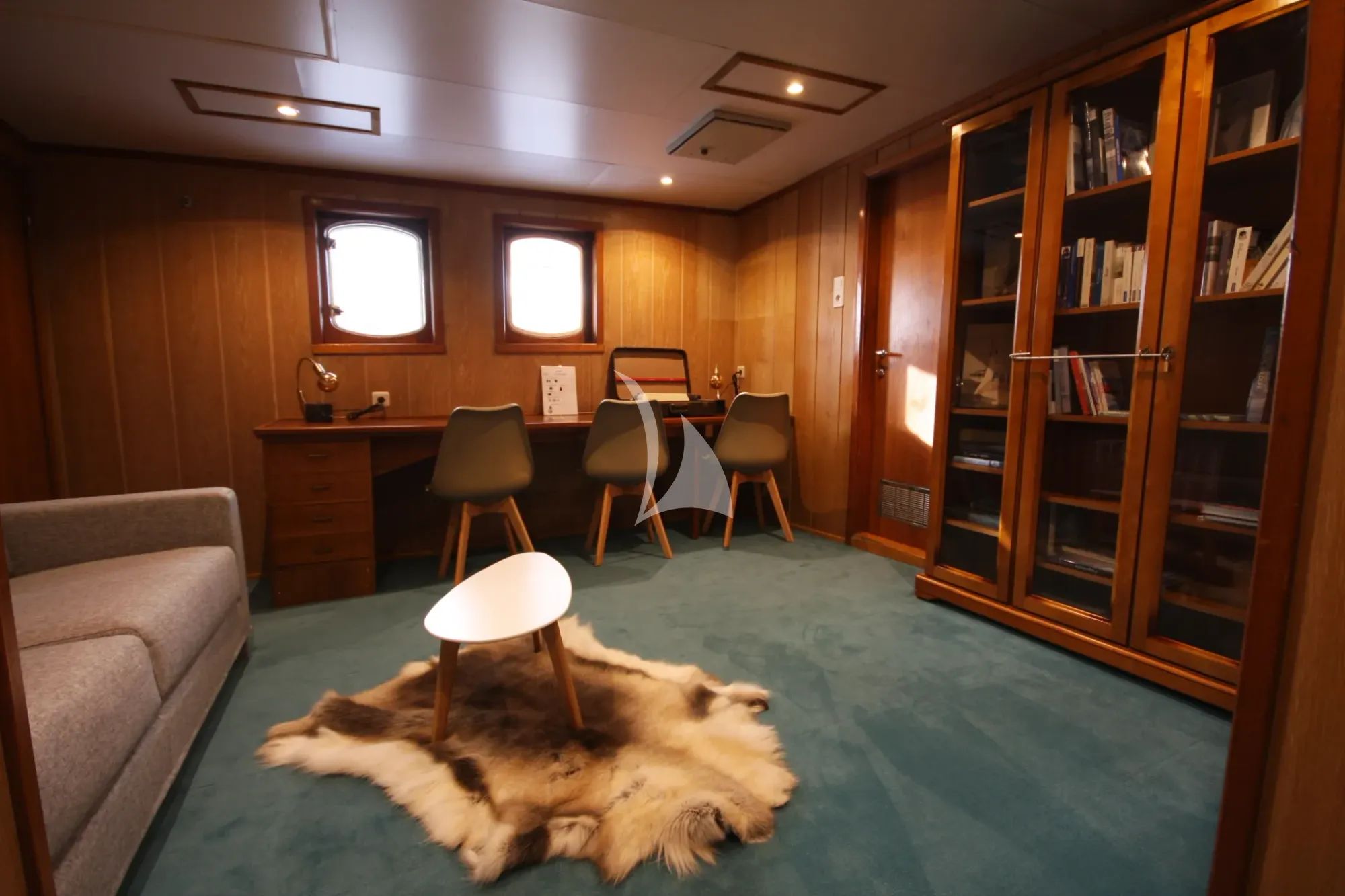 Inside, POLARFRONT radiates warmth and understated elegance. Her inviting saloon, accented by natural wood tones and bathed in light from panoramic windows, offers the perfect refuge after a day of exploration. Gather in the cozy library with a book and a cup of hot cocoa, or share stories over fine dining indoors. When night falls, retreat to her spacious cabins with private en-suites, each designed for deep rest and ultimate comfort.