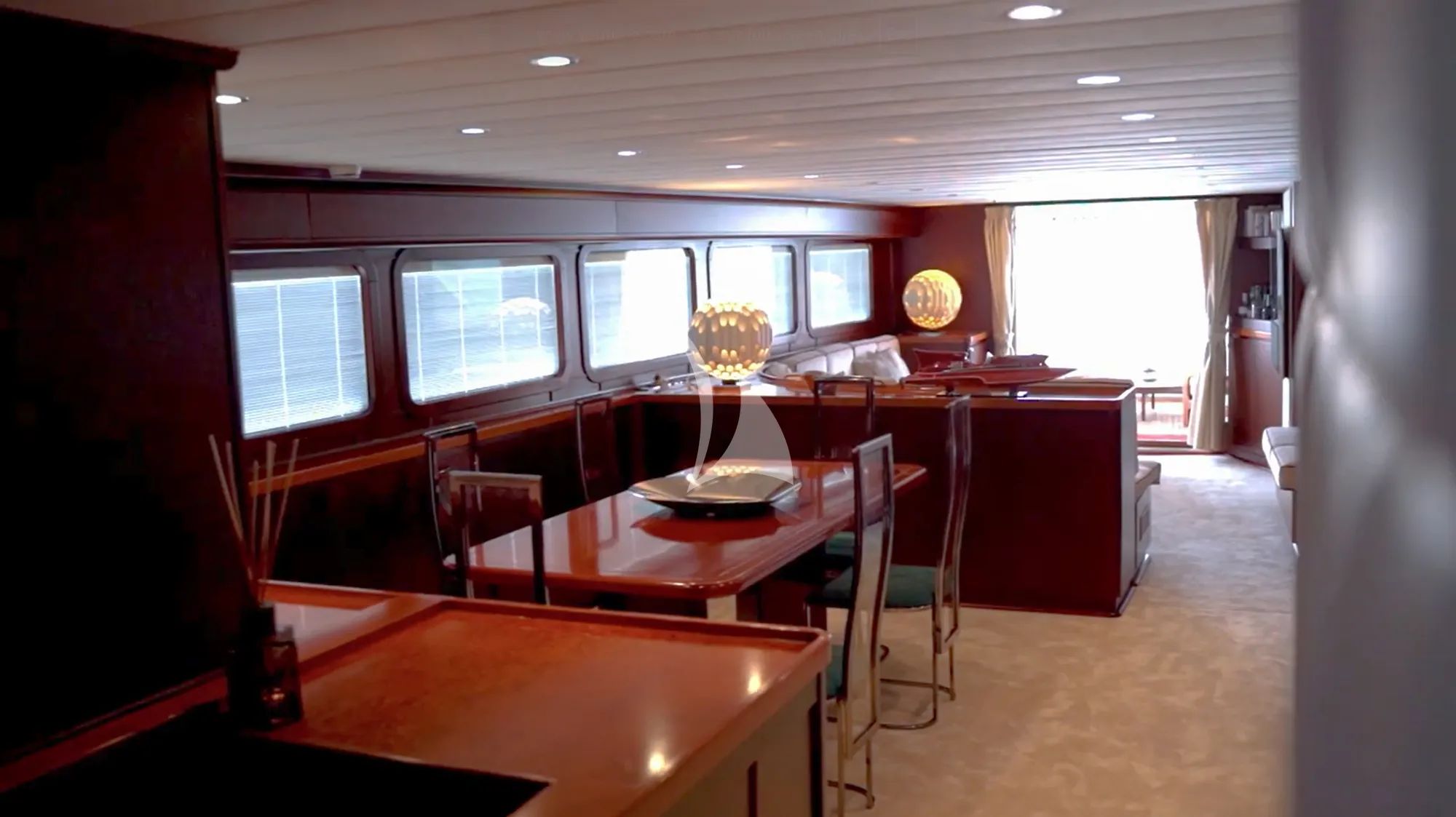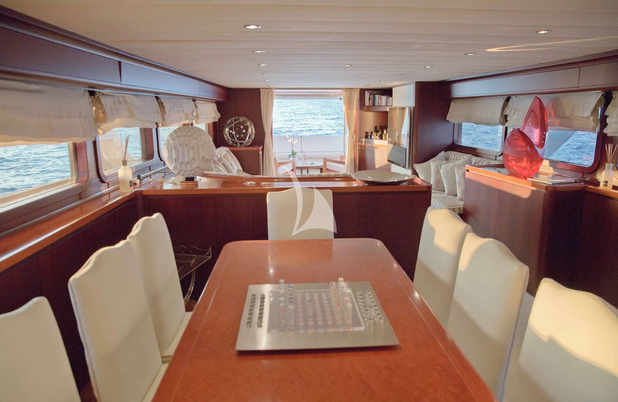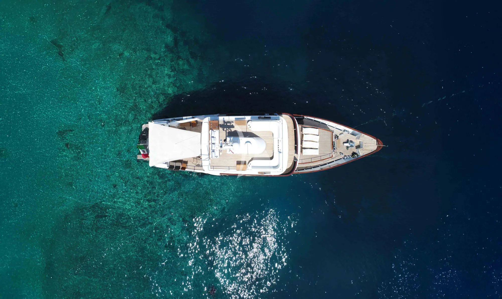 Inside, the yacht’s teak details create an immediate sense of warmth, giving the interior a cozy, welcoming character. The main saloon features a cozy lounge and an indoor dining area, surrounded by glass windows that flood the space with natural light. After fun-filled water activities, her well-appointed cabins with private bathrooms feel like a comfortable retreat, perfect for cooling down and resting well.