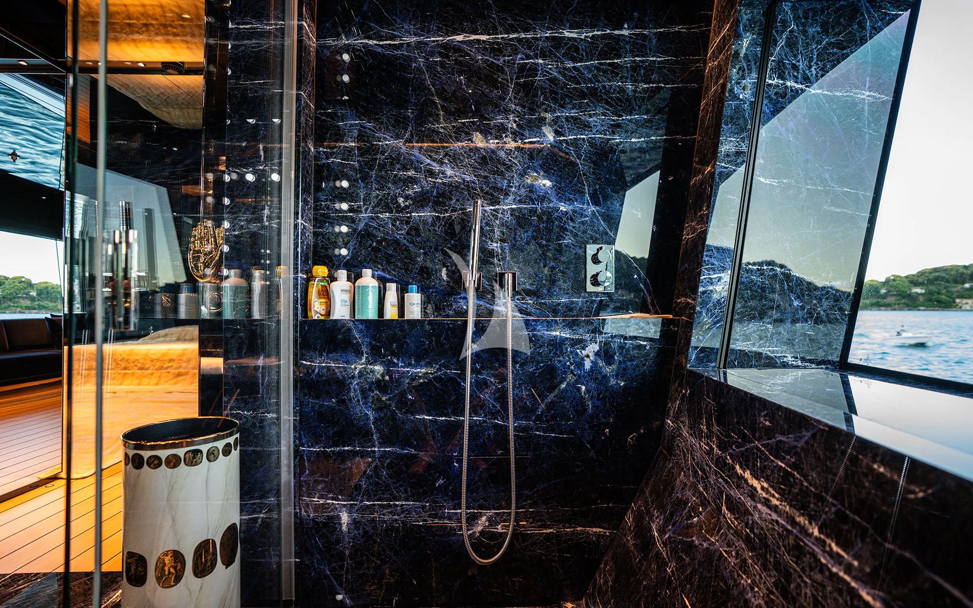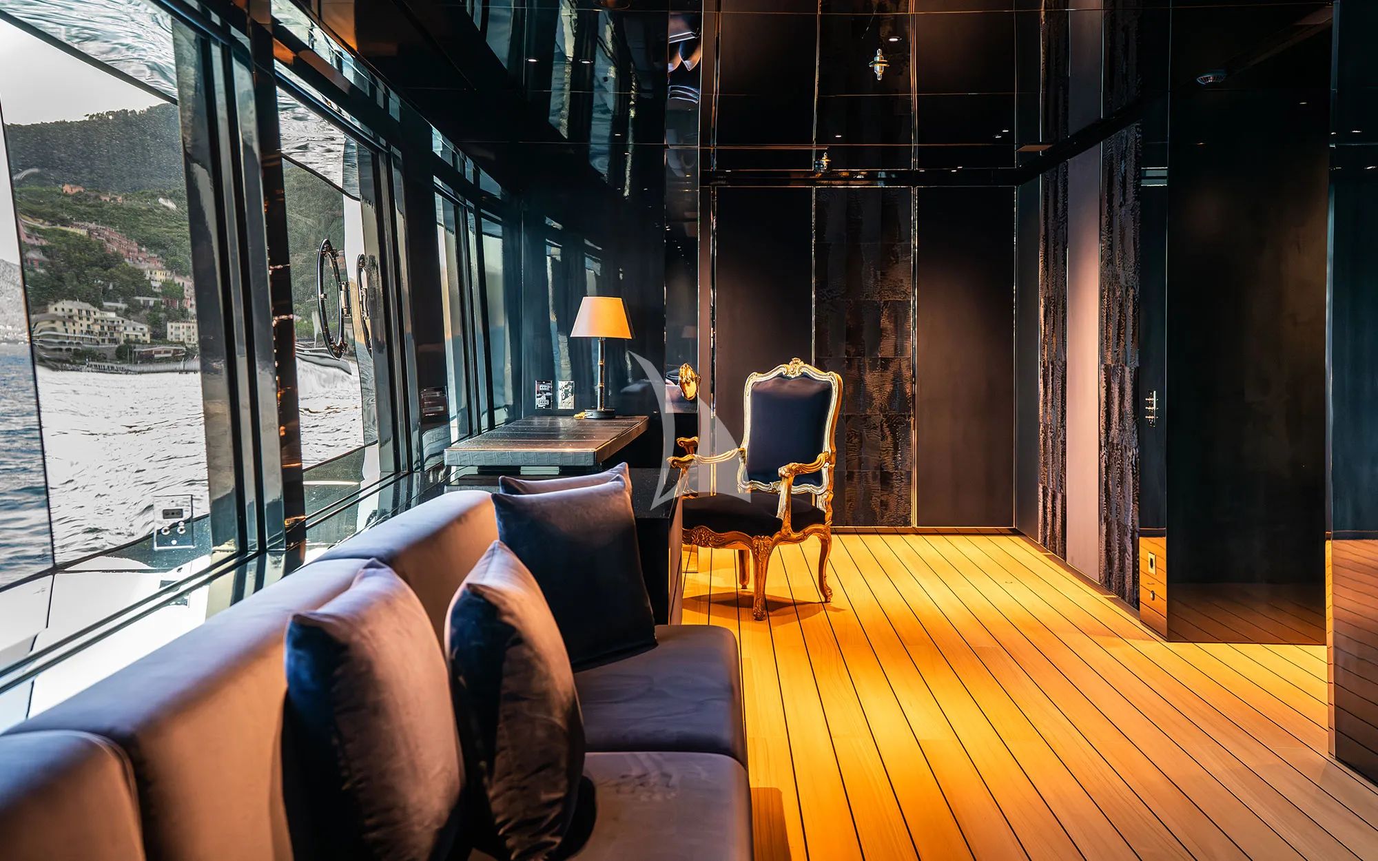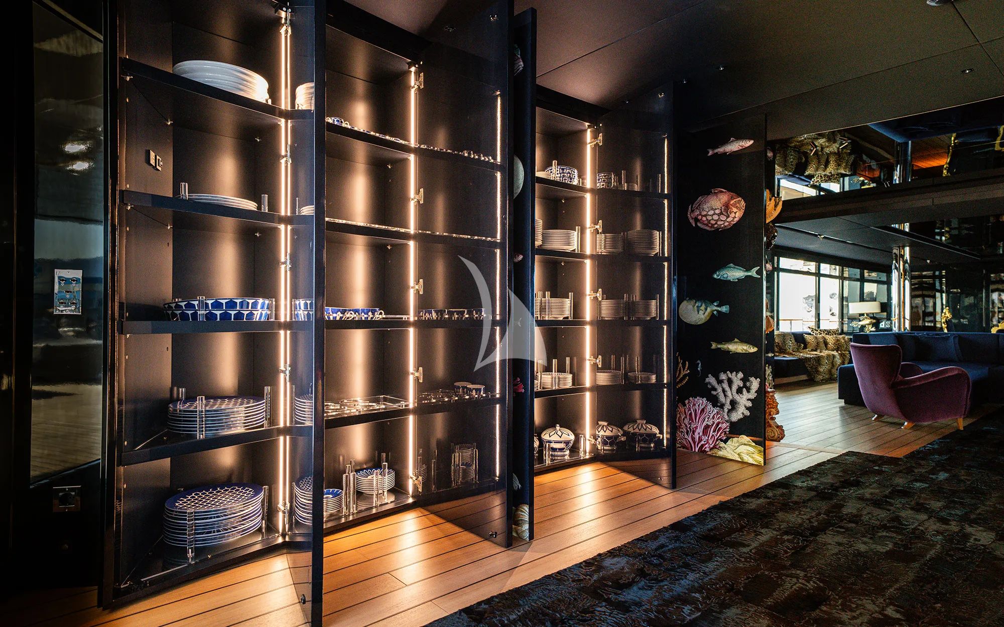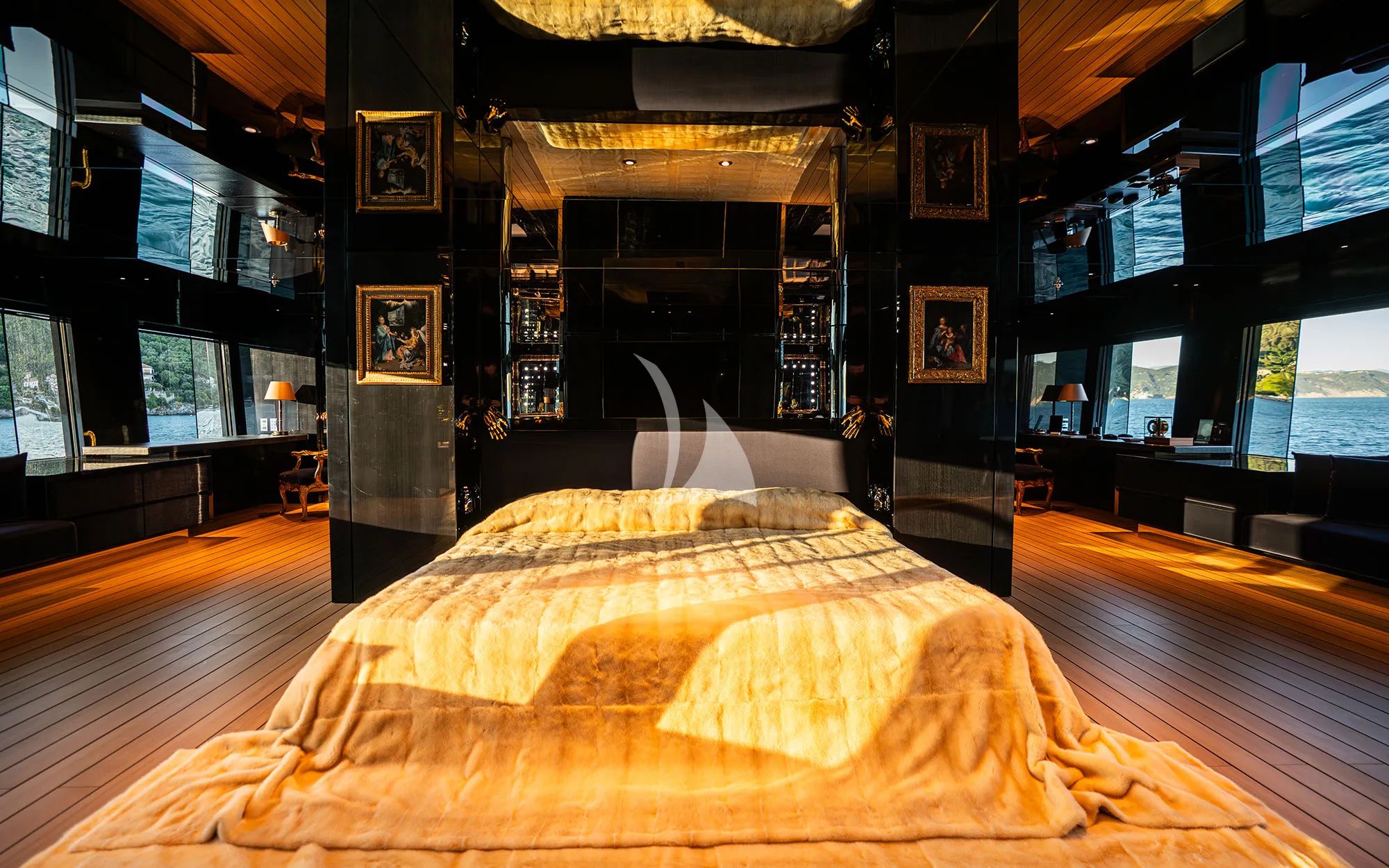 Step into the interior and the vibe shifts into something richer and more intimate. REGINA D`ITALIA’s luxurious black interior blends contemporary and traditional styles through black marble designs, dark mirror walls, and accent lighting that creates a cozy, inviting atmosphere. The main saloon’s eccentric, colorful aquarium design is striking and playful, giving you that underwater feeling without leaving the comfort of a refined living space. Glass windows surrounding the interior bring in natural light, keeping every corner radiant and balanced. At the end of the day, upscale cabins with private ensuite facilities deliver the optimum comfort, and the master cabin stands out with golden fabrics on the bed, glowing against the black walls and panels.