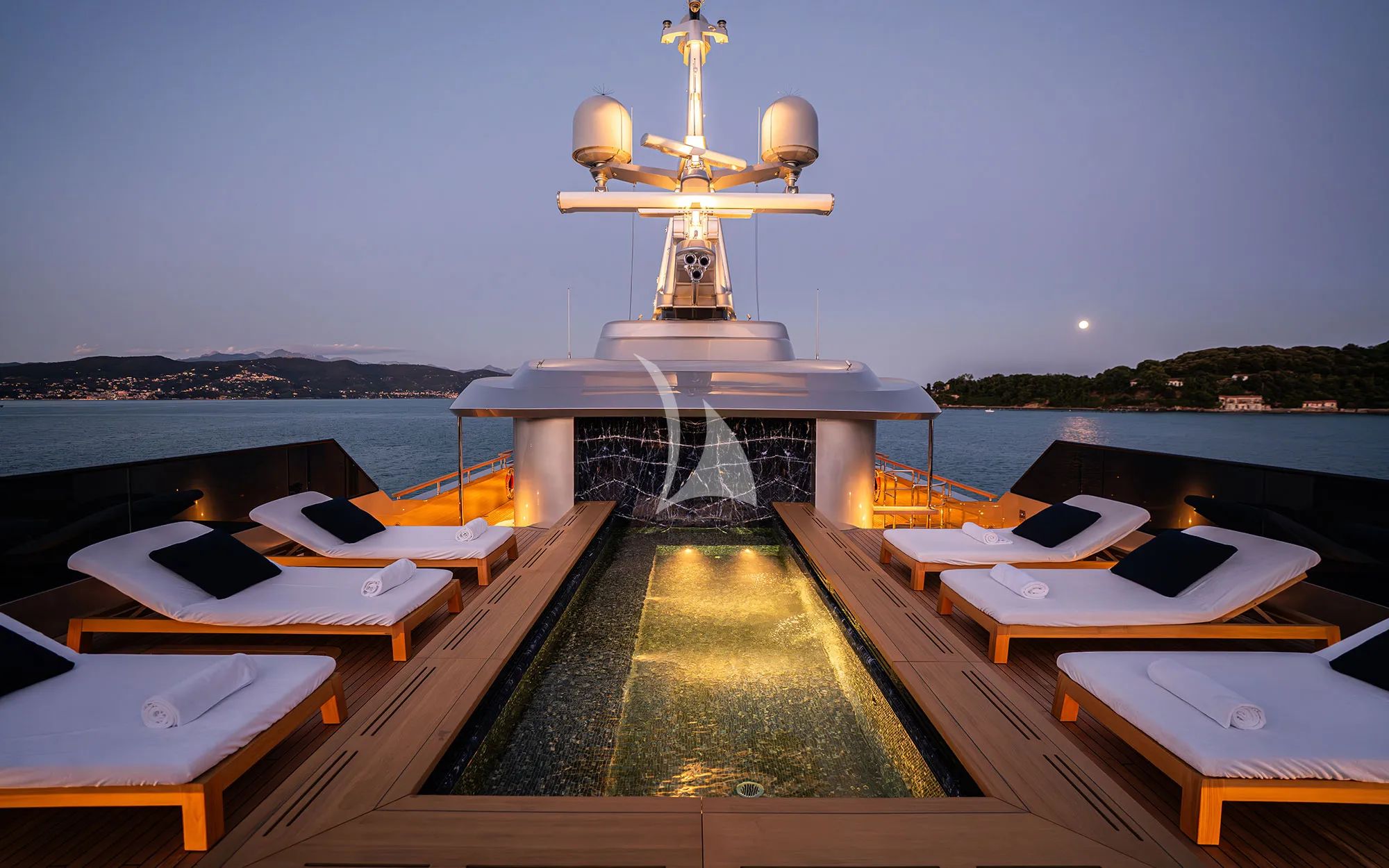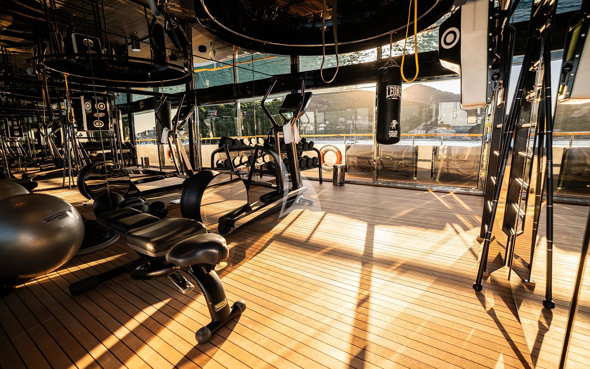 The sundeck is where the yacht turns into your personal lookout. Multiple sunbeds line up beside the infinity pool, and Portofino spreads out beneath you, colourful, calm, and made for slow appreciation. Well-appointed lounging areas invite you to settle in, feel the sea breeze, and open a Super Tuscan wine while conversations stretch out the way they should on holiday. As evening arrives, the sky deck becomes a lively alfresco dining setting, with your chef serving flavorful Italian dishes under the kind of sunset that makes everyone reach for their phone, then forget it again because the moment is better live. The gym and equipment are there too, so you can keep your fitness goals on track between long lunches and late dinners.
