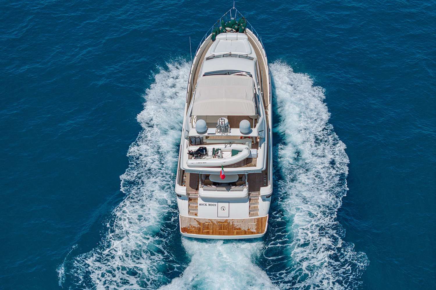 The Posillipo Technema 70 luxury motor yacht, ROCK MOON, boasts a sleek, sporty white exterior engineered for a flawless and luxurious charter experience across Sardinia. Designed with state-of-the-art amenities, this remarkable yacht offers an unparalleled combination of style, comfort, and functionality, ensuring an extraordinary journey for everyone aboard.