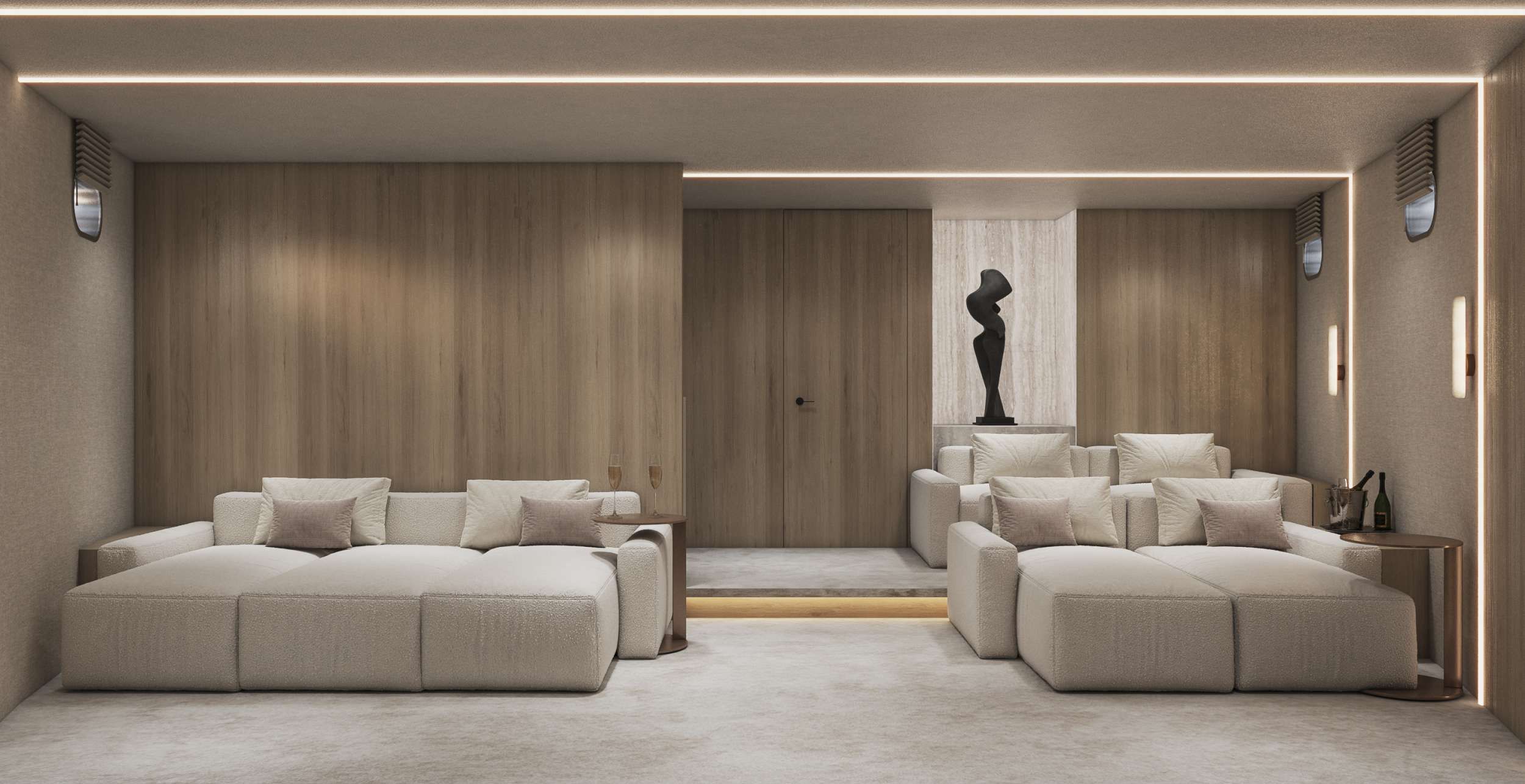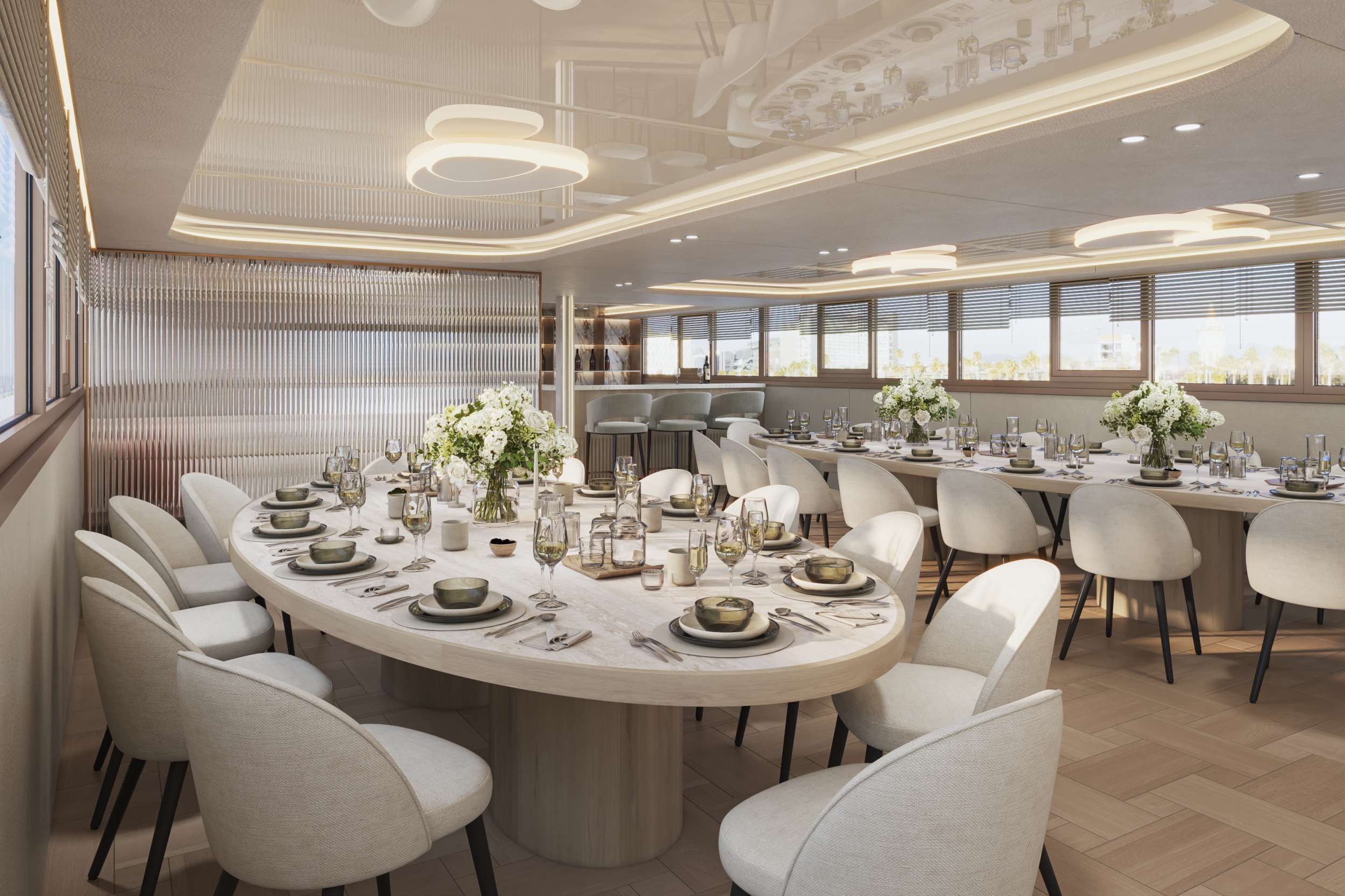 Inside, ROKO presents a bright white-themed interior where modern and contemporary design meet in a setting softened by light wooden accents. Surrounded by large windows, the saloon feels luminous and open, creating a relaxed atmosphere for reading, gathering, or simply enjoying the quiet comfort of the space. Multiple lounging areas make the main salon feel versatile and welcoming, while the principal dining area is beautifully arranged for intimate dinners and larger celebrations alike. The cinema room with cozy seats adds another thoughtful layer for evenings onboard, and the guest accommodation, comprising 1 king and 13 doubles with private marble ensuite bathrooms, is designed to leave everyone rested and ready for what comes next.