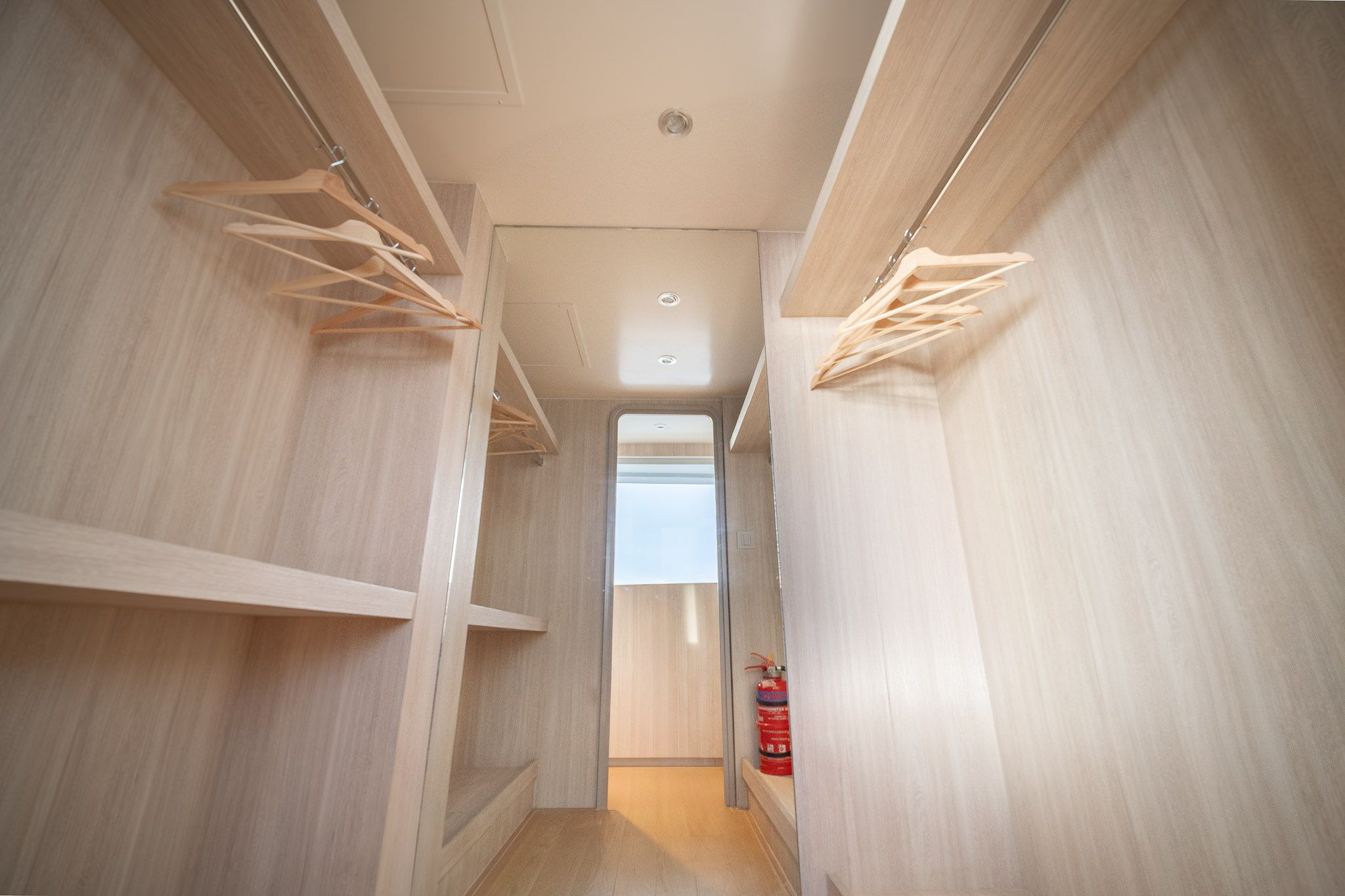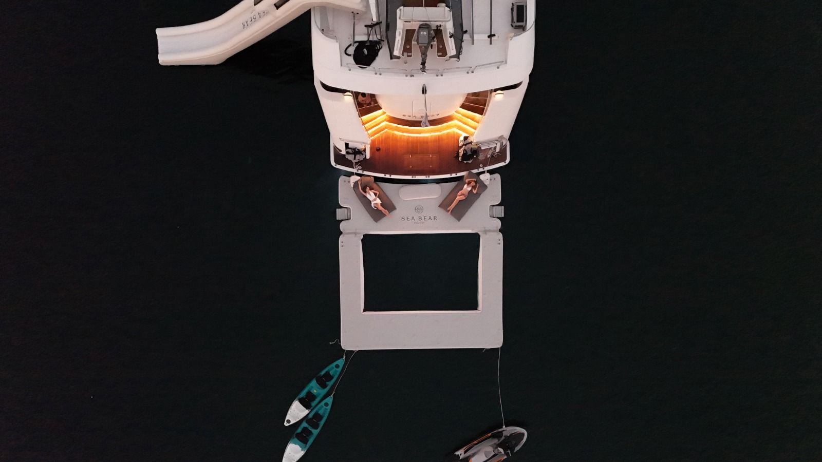 SEA BEAR’s interior blends contemporary lines with generous glazing that fills the space with natural light. The ambiance feels bright and calm, making time spent indoors just as enjoyable as time on deck. The master cabin elevates the onboard living experience with a spacious layout that includes a comfortable couch, a dedicated vanity area, a generous bed designed for deep rest, and a walk-in closet that allows guests to settle in with ease. Private en suite cabins throughout the yacht provide a welcoming retreat, ensuring guests feel rested and ready for each new day.