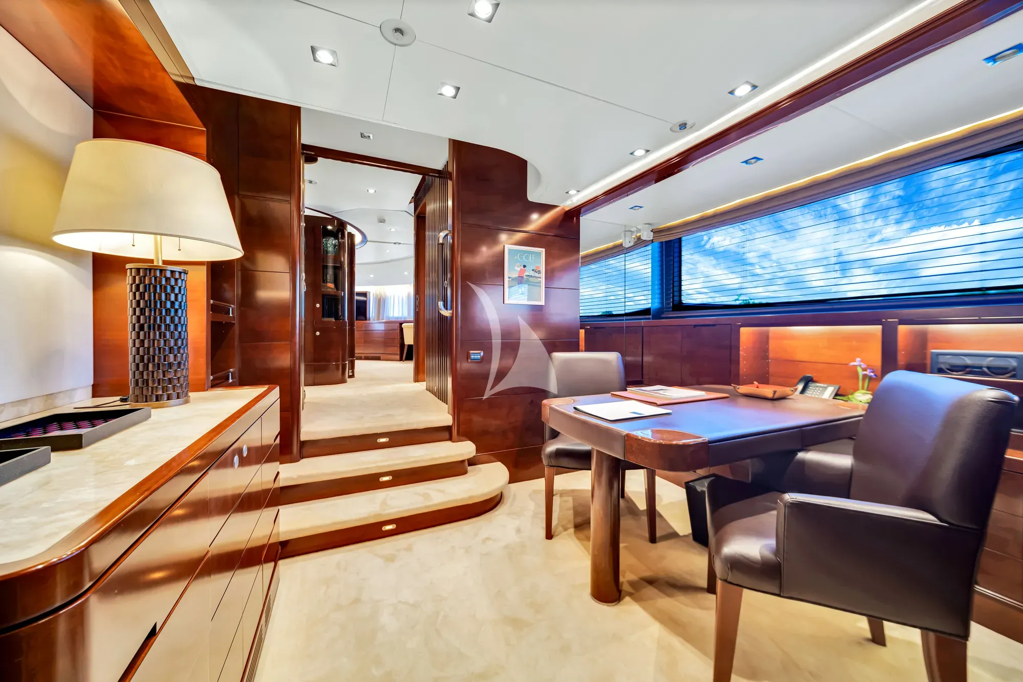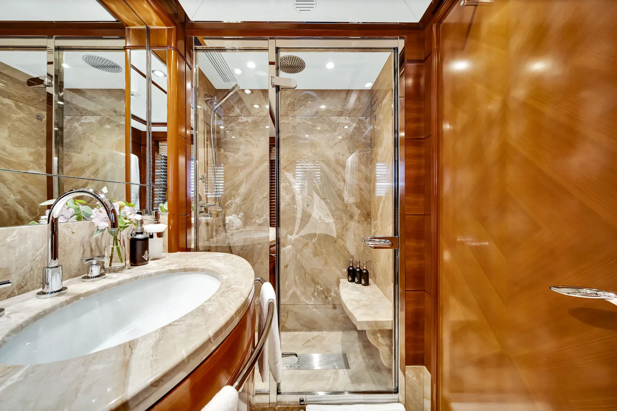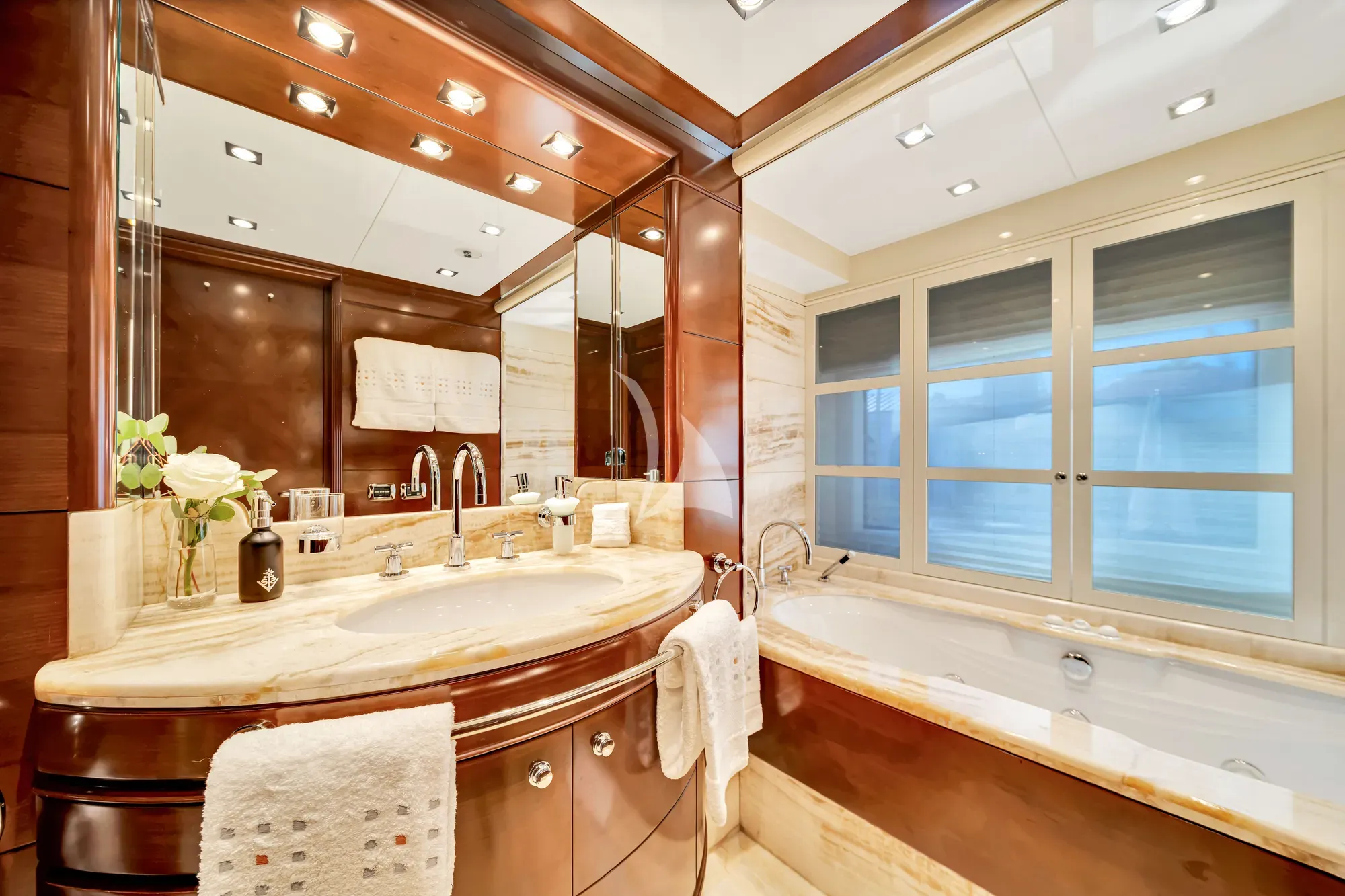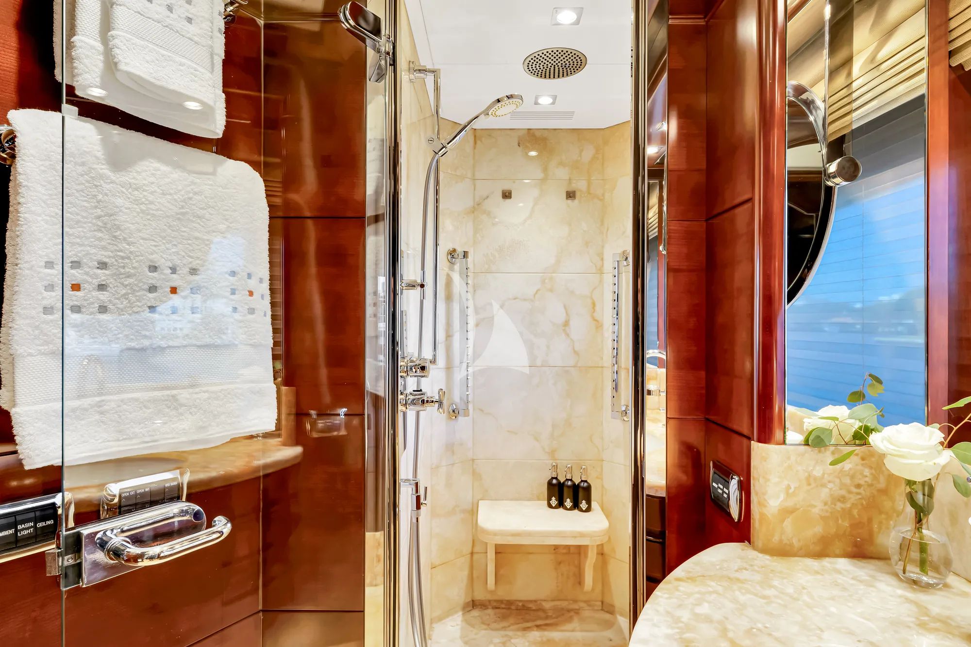Inside, SEASCAPE V reveals a different charm, where polished finishes and soft tones create a welcoming, elevated setting. Her opulent, dreamy interior is anchored by a radiant saloon that feels equally suited to relaxed downtime and lively celebrations, while the indoor dining area offers a more intimate stage for special menus and wine pairings. Each of her luxurious cabins features a private bathroom and is dressed with teak accents and off-white fabrics that create a homey ambiance without ever losing the sense of indulgence. The master cabin is particularly impressive, offering a king bed, huge LED TV, dedicated vanity unit, separate private office, and an en-suite bathroom with its own bathtub, giving you a private refuge where you can reset in total comfort.