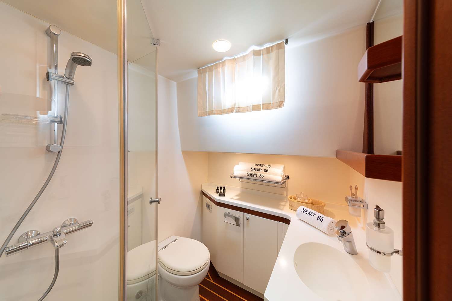 The bright and spacious theme is carried on through inside the cabins which are tastefully decorated and provide the utmost comfort and luxury. Main lighting throughout Serenity 86, including all the lighting in all the rooms makes use of spot lights located on the roof.