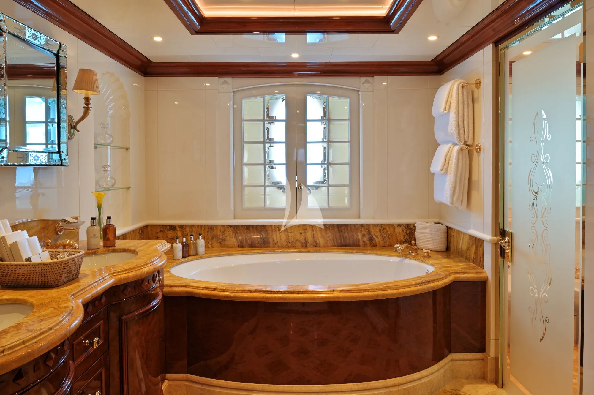 Below deck, the interior atmosphere shifts to understated comfort, where modern and contemporary styling is enhanced by extensive glass throughout the saloon, dining area, and galley. Each cabin provides a private bathroom and generous space to unwind, with the two-level master suite offering a distinct sense of retreat through its king bed, lounge, office, and bathtub-equipped bathroom.