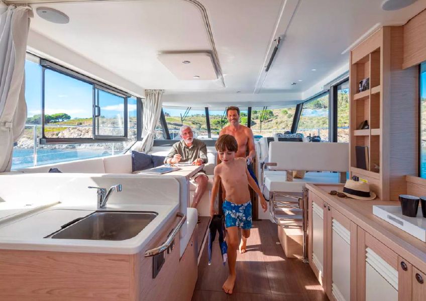 Aboard, the mood feels bright, sociable, and wonderfully removed from the shoreline crowds. The sundeck becomes a favorite open-air lounge for drinks, laughter, and easy conversation under the Riviera sun, while the foredeck invites a calmer kind of pleasure with space for sunbathing and quiet coastal views. Her interior continues the comfort with modern lines, soft finishes, and an inviting saloon with galley, giving guests a refined place to pause between outdoor moments. With 3 double cabins available for a quick rest, the yacht creates a satisfying mix of exploration, downtime, and effortless French Riviera living.