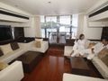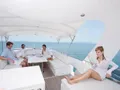 The deck saloon on this luxury charter yacht is separated by a glass door from the alfresco lounge in the aft. Inside the salon, the sofa and its Sony flat 46 inch screen pop-up LCD TV, sit separate from the 8-seat dining table. Sophisticated Bose and Sony entertainment systems are installed throughout this luxury yacht, and all cabins and interior areas are fully air conditioned.