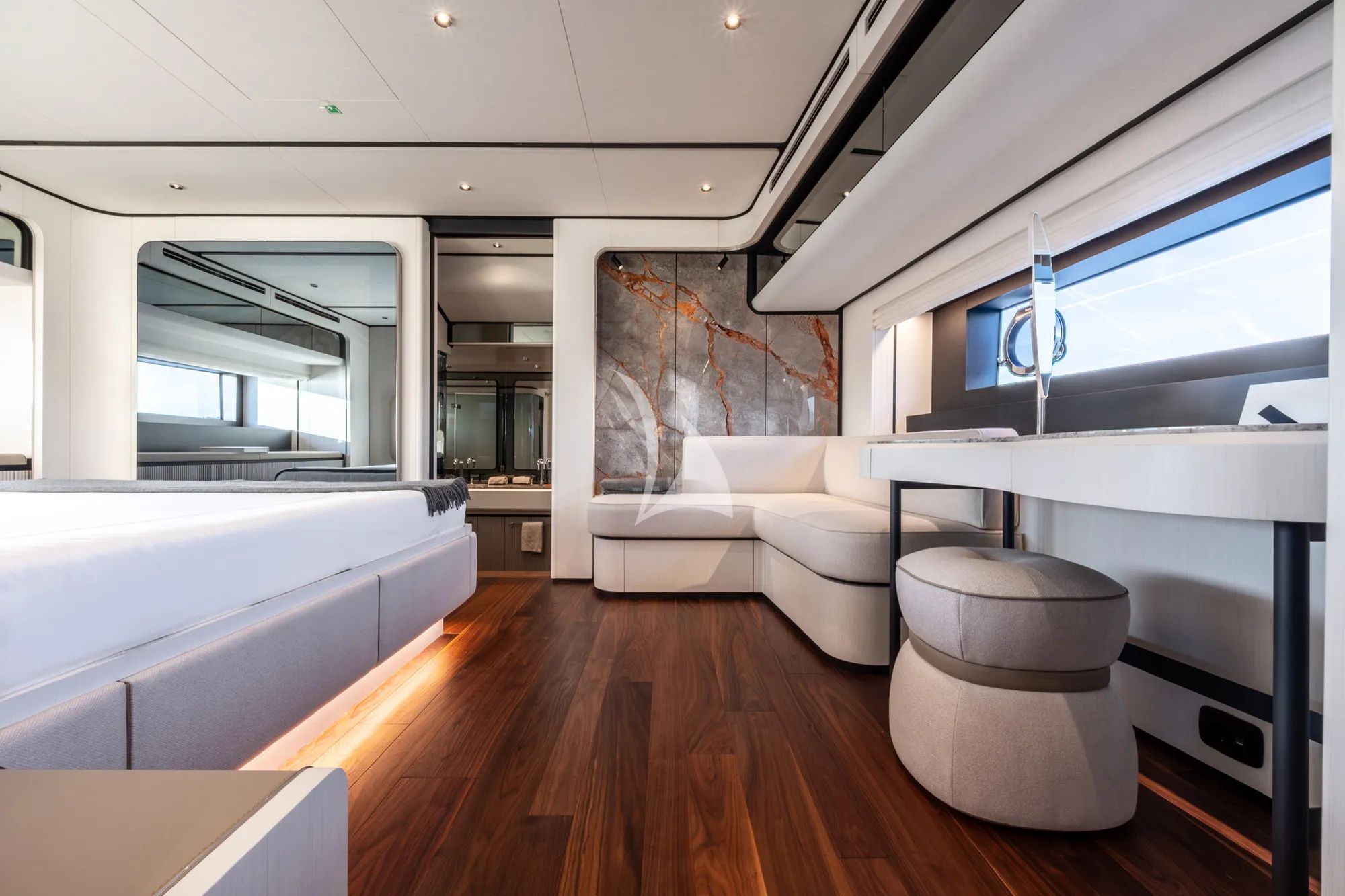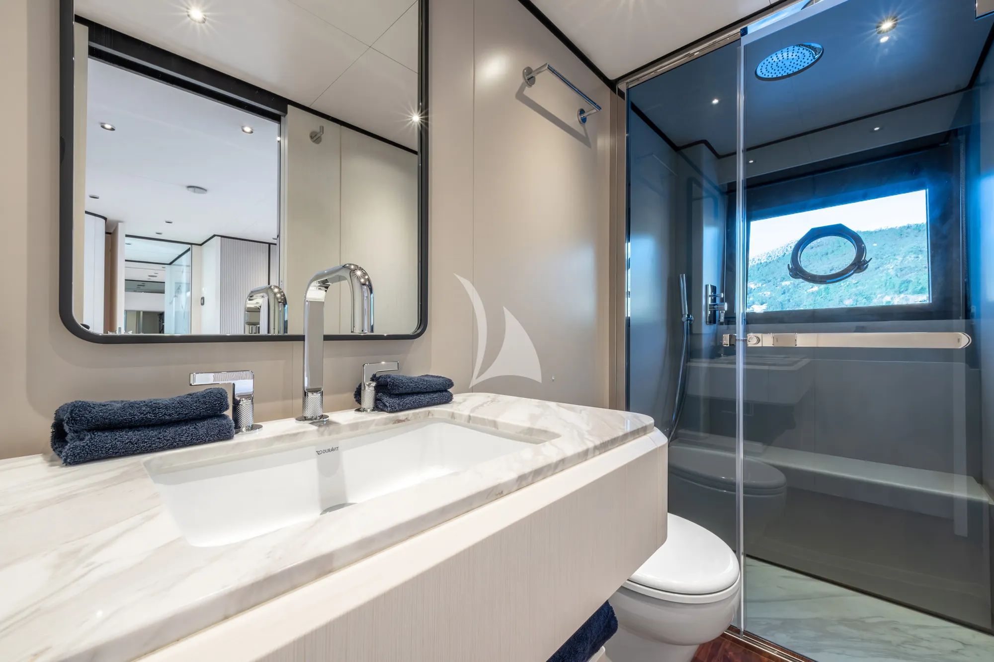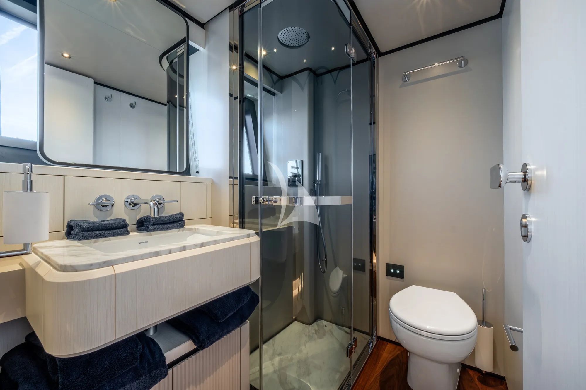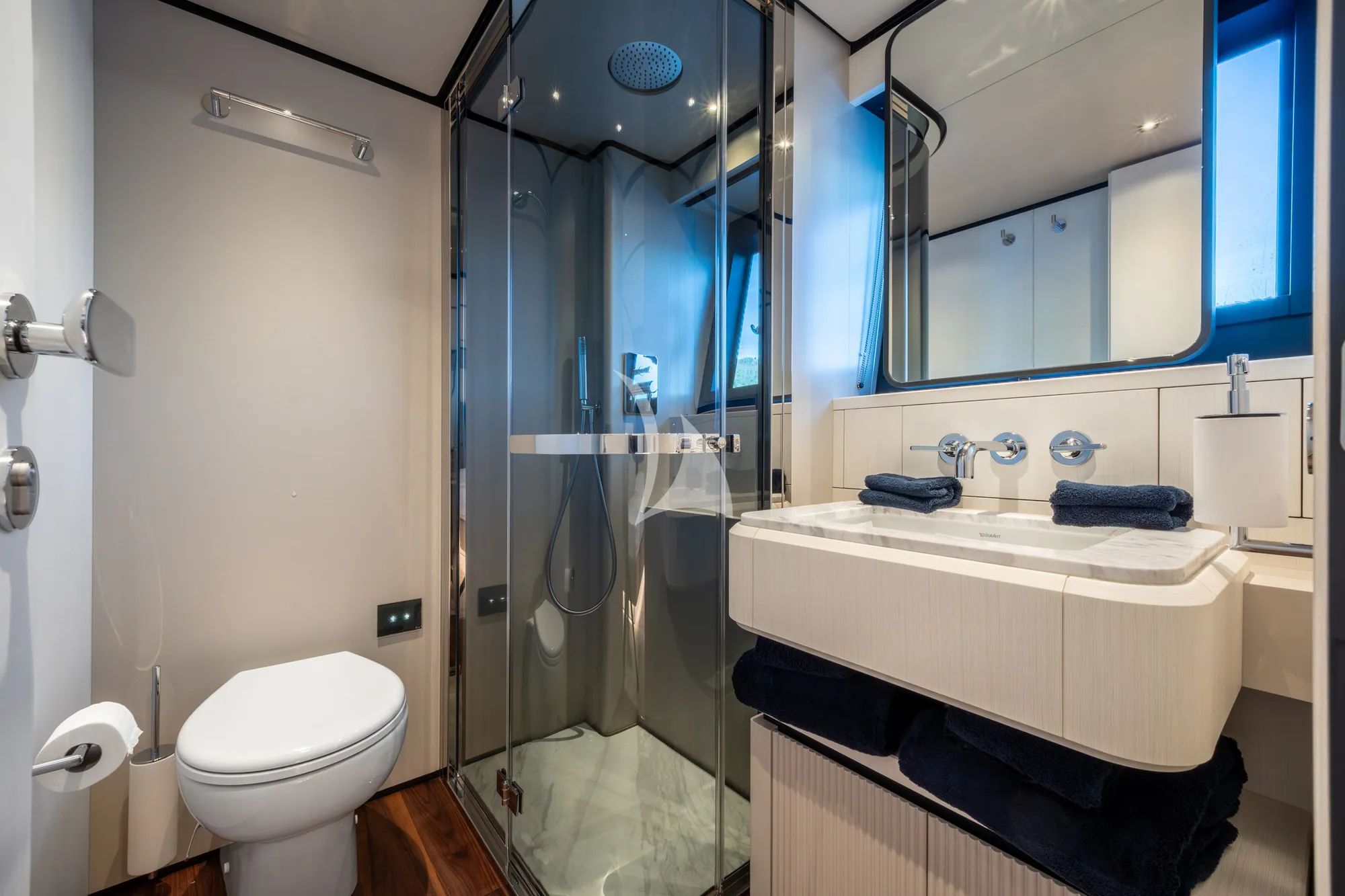Stepping indoors, you discover an interior that captures the essence of contemporary Riviera living. The saloon, dining area, and galley are wrapped in large glass panels, inviting in natural light and offering continuous views of sea and shore. Glass fixtures and thoughtfully chosen décor elements add a touch of refinement, creating an environment that feels polished yet welcoming. It is a space designed for slow afternoons, intimate gatherings, and relaxed evenings when you want to stay on board and enjoy the yacht’s atmosphere. As the day winds down, TOGETHER’s cabins provide sanctuary-like comfort, each one spacious and equipped with a private bathroom to ensure privacy for all guests. Soft textiles, warm woods, and careful lighting combine to create a restful mood that prepares you for another day of coastal exploration.