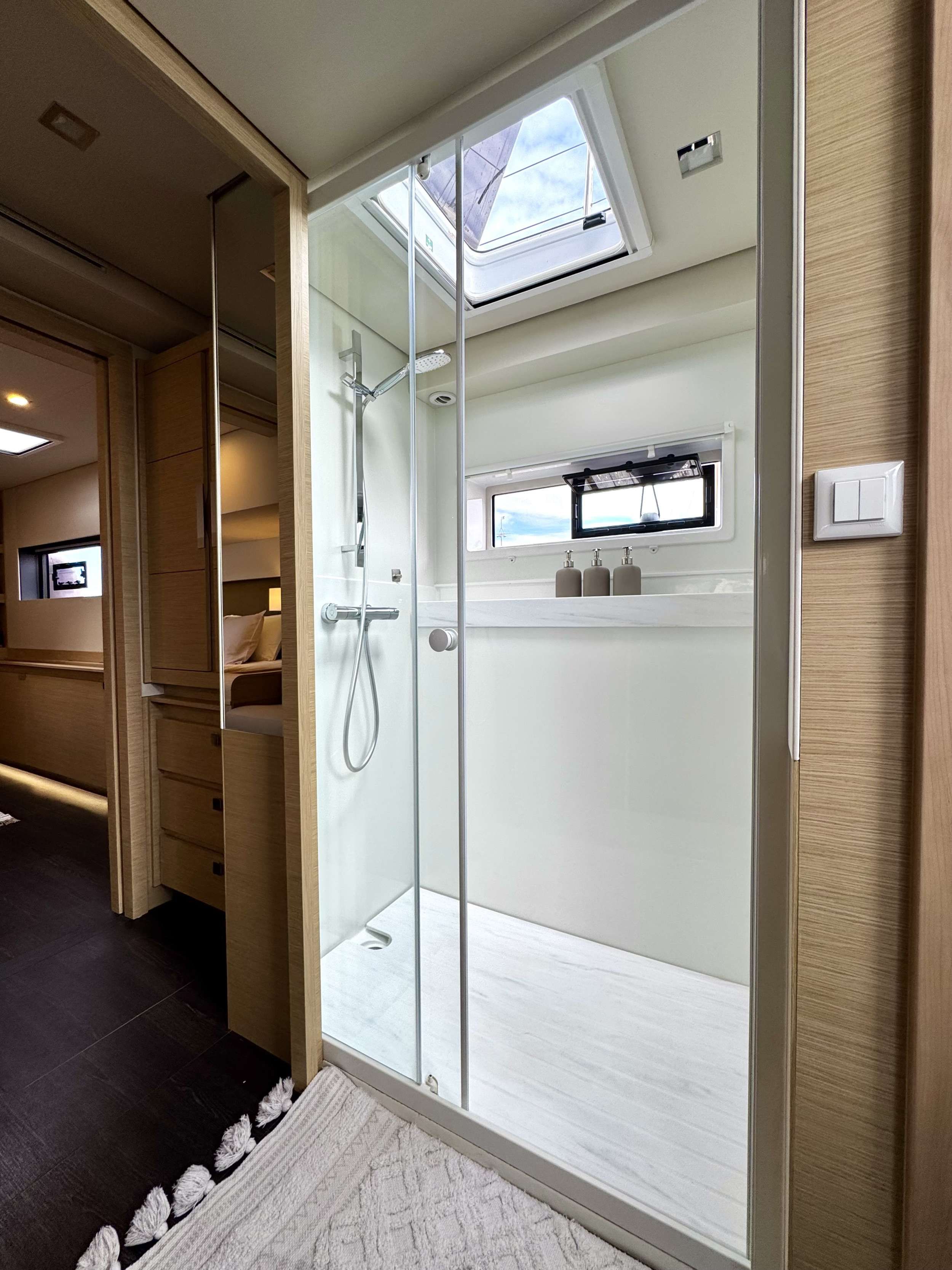 Inside, TRANQUILA’s atmosphere shifts into a warm, modern living space where natural light enhances every finish. The saloon and indoor dining area create the perfect balance between style and comfort, whether you are celebrating indoors or resting between excursions. Each cabin with its private ensuite offers a quiet, restorative retreat after sun-filled hours on deck.