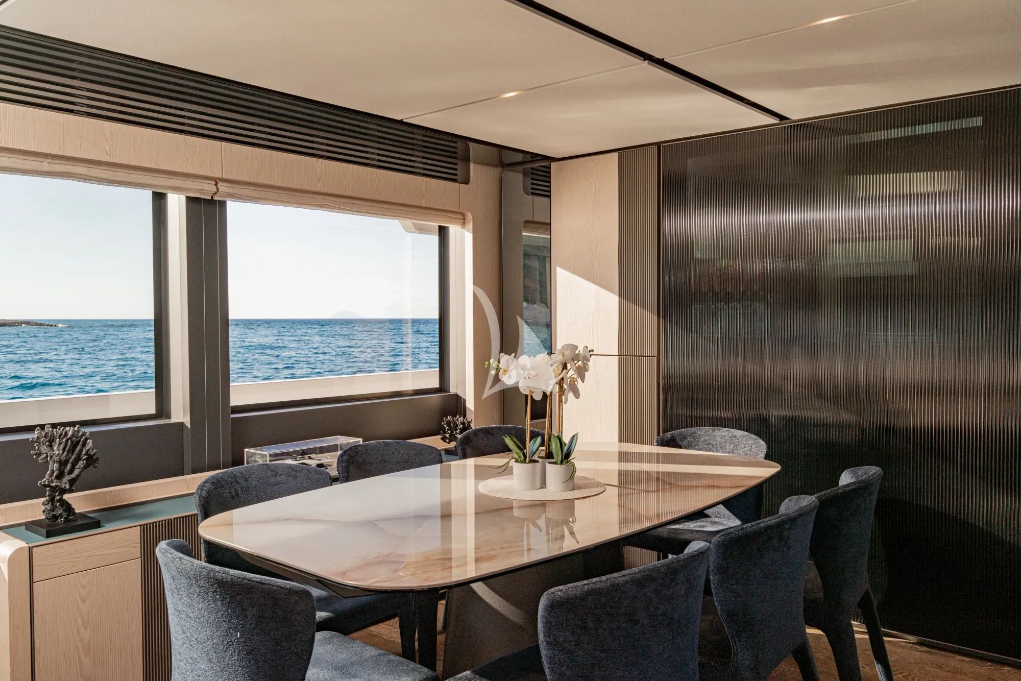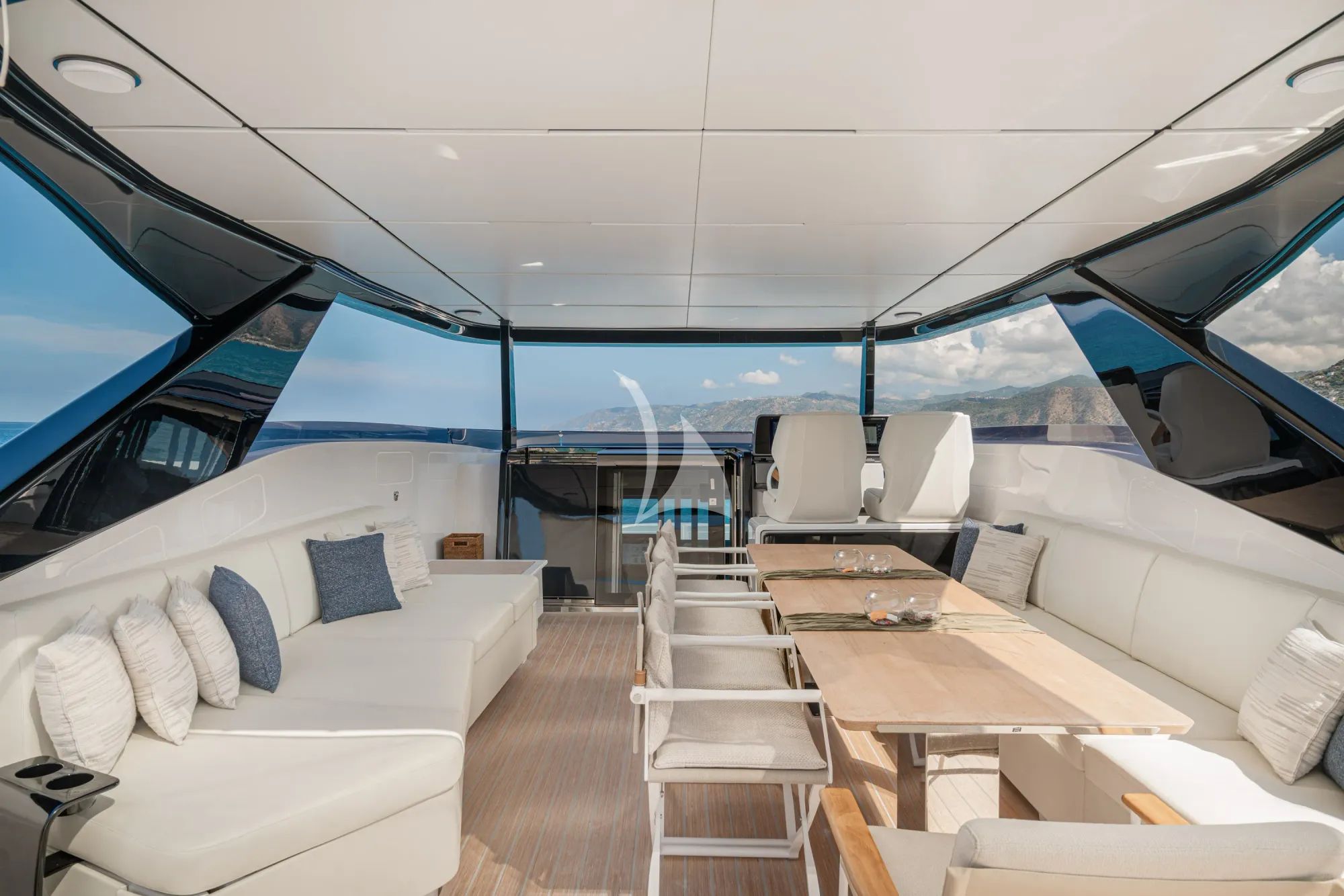 Begin your day lounging on the foredeck, where an elegant seating area invites you to bask under the Sicilian sun as the sea glimmers in every direction. The foredeck's sunroof design lets you enjoy both light and shade in perfect balance, making it the ultimate space for relaxation. When evening arrives, indulge in a refined alfresco dinner on the aft deck, as the sun sets beyond Panarea’s chic harbor. For sweeping views and serenity, retreat to the flybridge, a spacious sanctuary featuring a covered lounge, dining area, and sun pads where you can sip cocktails and take in Stromboli’s volcanic silhouette.