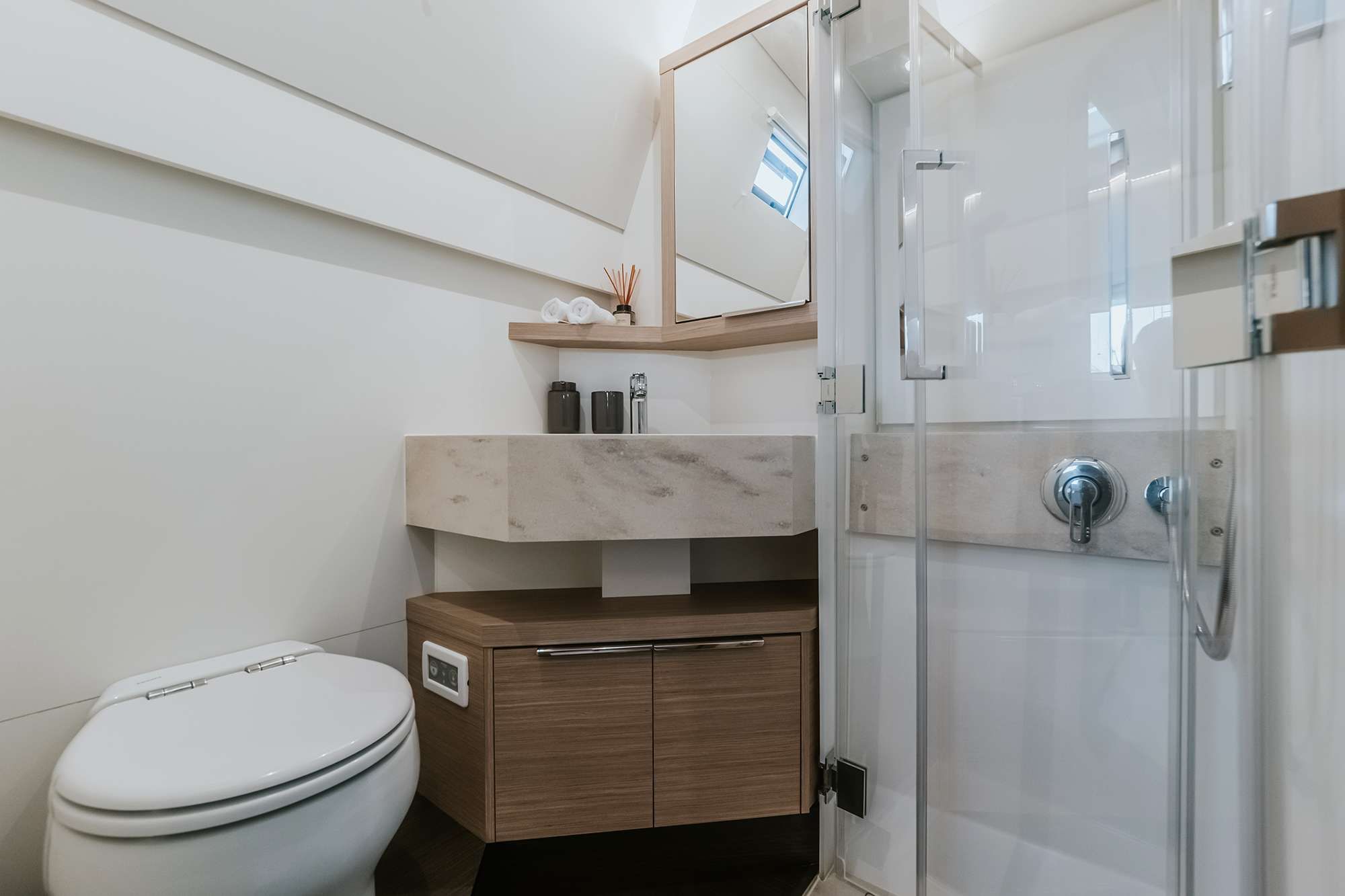 Crossing into the interior feels like stepping into a calm, modern retreat where light teak and clean lines set a peaceful tone. The saloon flows naturally from social space to dining area, making it just as inviting during a lively lunch as it is during a quiet evening. Private ensuite cabins add comfort and intimacy, making every night aboard feel restorative.
