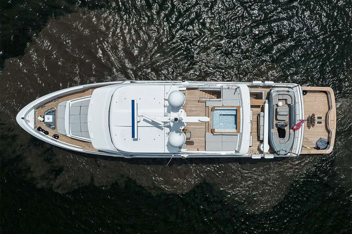 Outdoor living centers around the aft deck and extended swim platform, where mornings often begin with water access and afternoons unfold in the shade beside the sea. This flexible area supports everything from fishing activity to relaxed lounging. Wide side decks connect guests smoothly to the forward spaces, encouraging easy movement throughout the yacht. The sundeck offers a private escape above it all, featuring a mosaic-tiled Jacuzzi, sunpads, a full bar, barbecue, and shaded lounge seating, making it an inviting setting for open-air dining and sunset gatherings while exploring the Exumas.