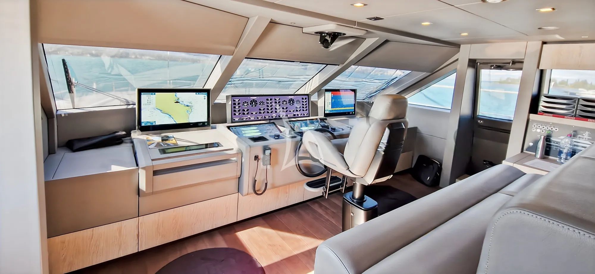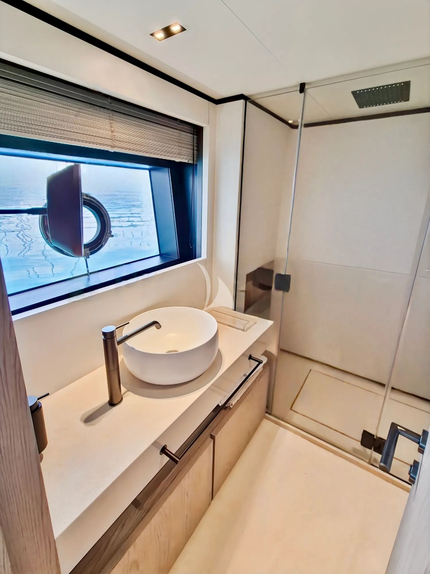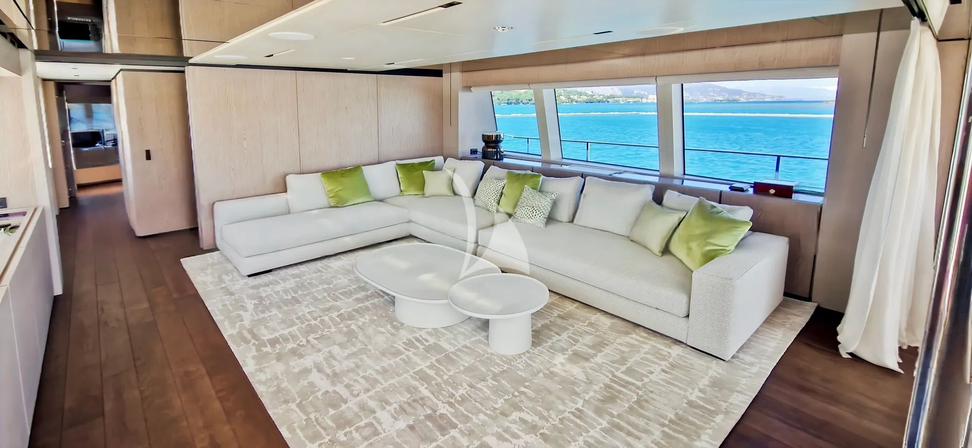 Step inside and the atmosphere shifts into cool, modern comfort, with contemporary design touches, glass fixtures, and subtle green accents in pillows, sheets, and decor that add freshness to the space. Large surrounding glass windows wrap the saloon and indoor dining area, letting natural light pour in and giving the interior a radiant feel throughout the day. After swimming and water time, retreat to spacious upscale cabins with private bathrooms, a quiet reset that makes tomorrow feel easy. The master cabin elevates the experience with a king bed and a huge LED TV, perfect for winding down before another Riviera day.