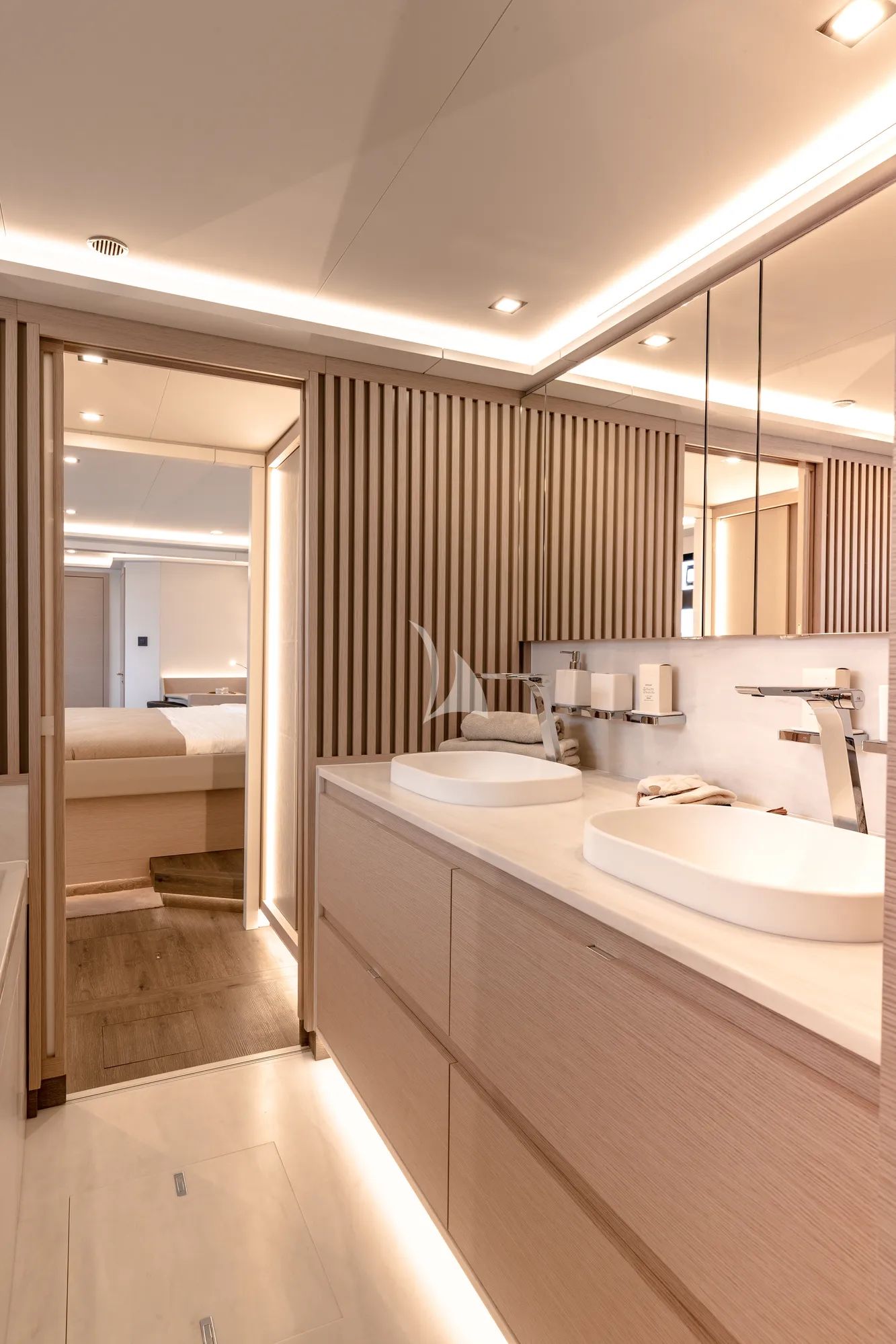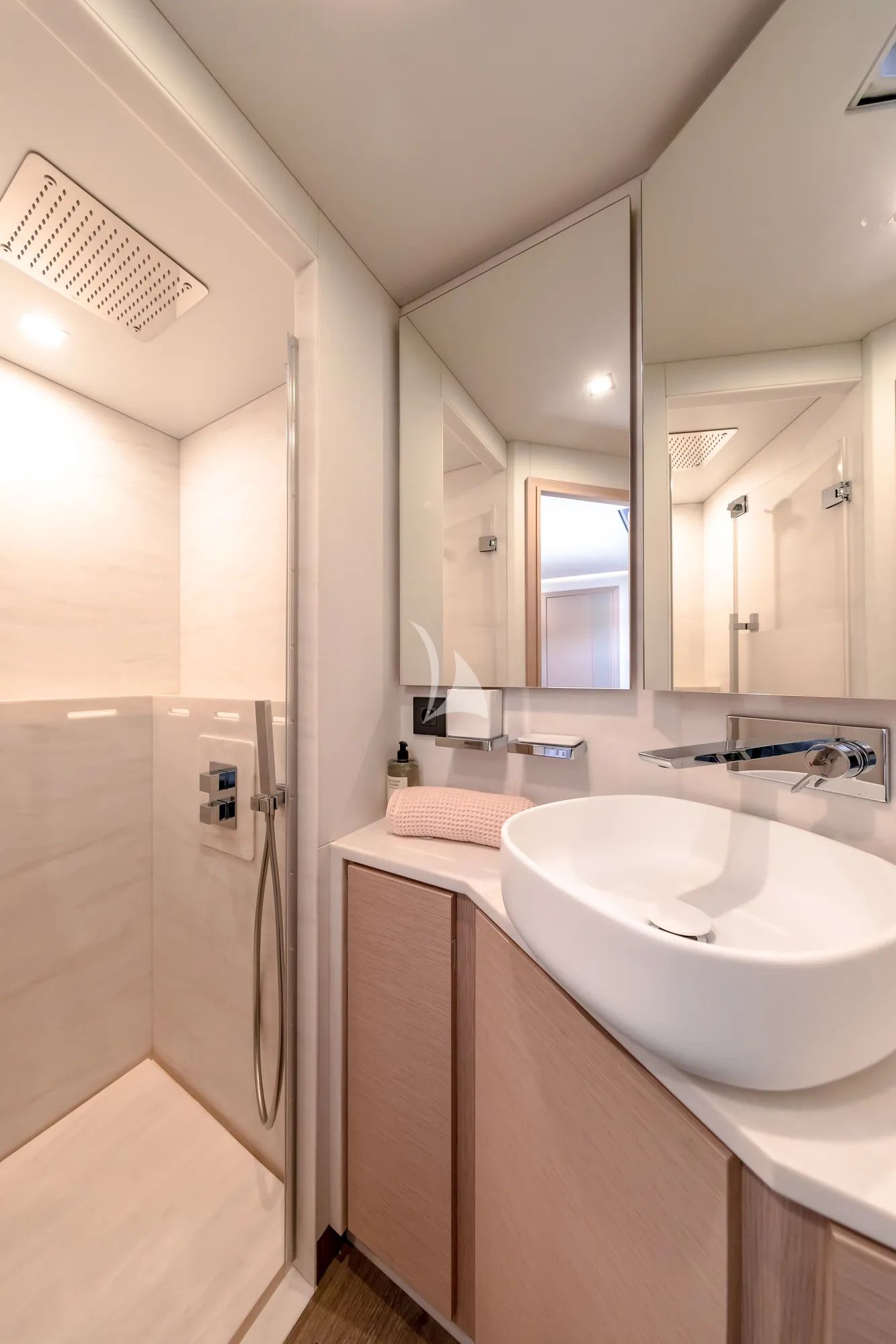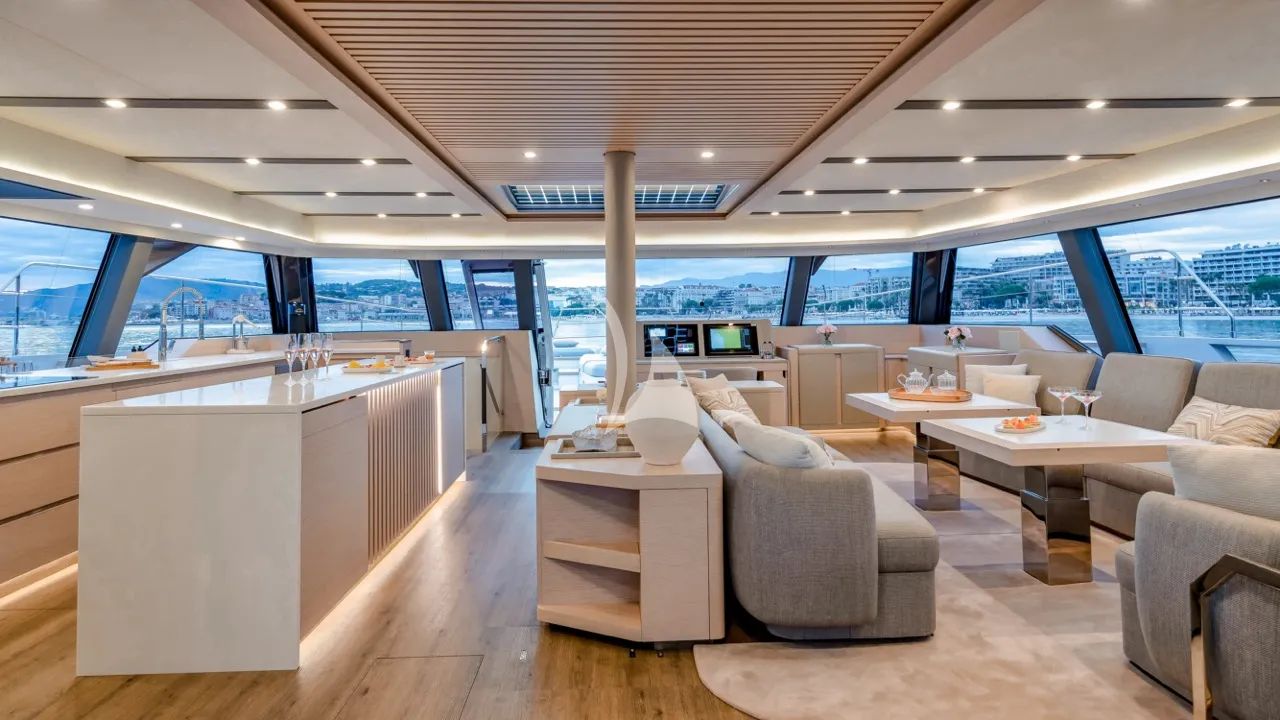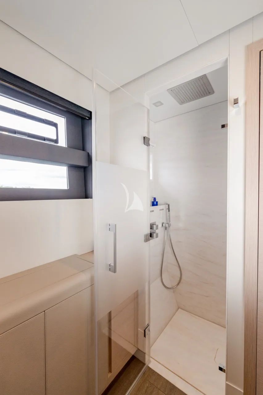 Inside, the catamaran’s modern interior is softened by teak accents and bathed in natural light from surrounding glass windows. The saloon and dining area create a comfortable space for celebrations and shared moments, while the cabins with private bathrooms provide a quiet retreat designed for rest and renewal.
