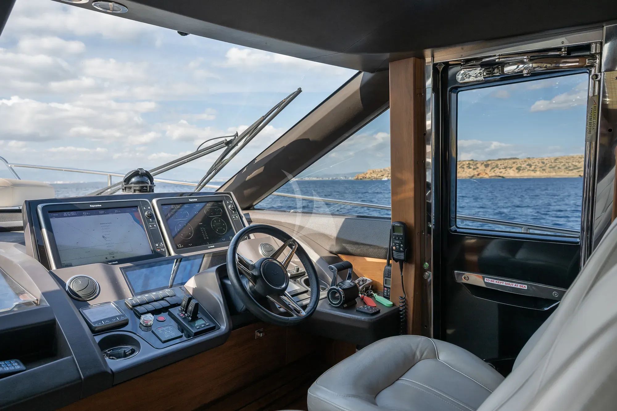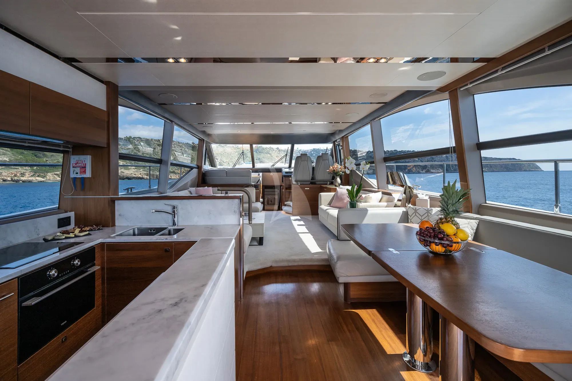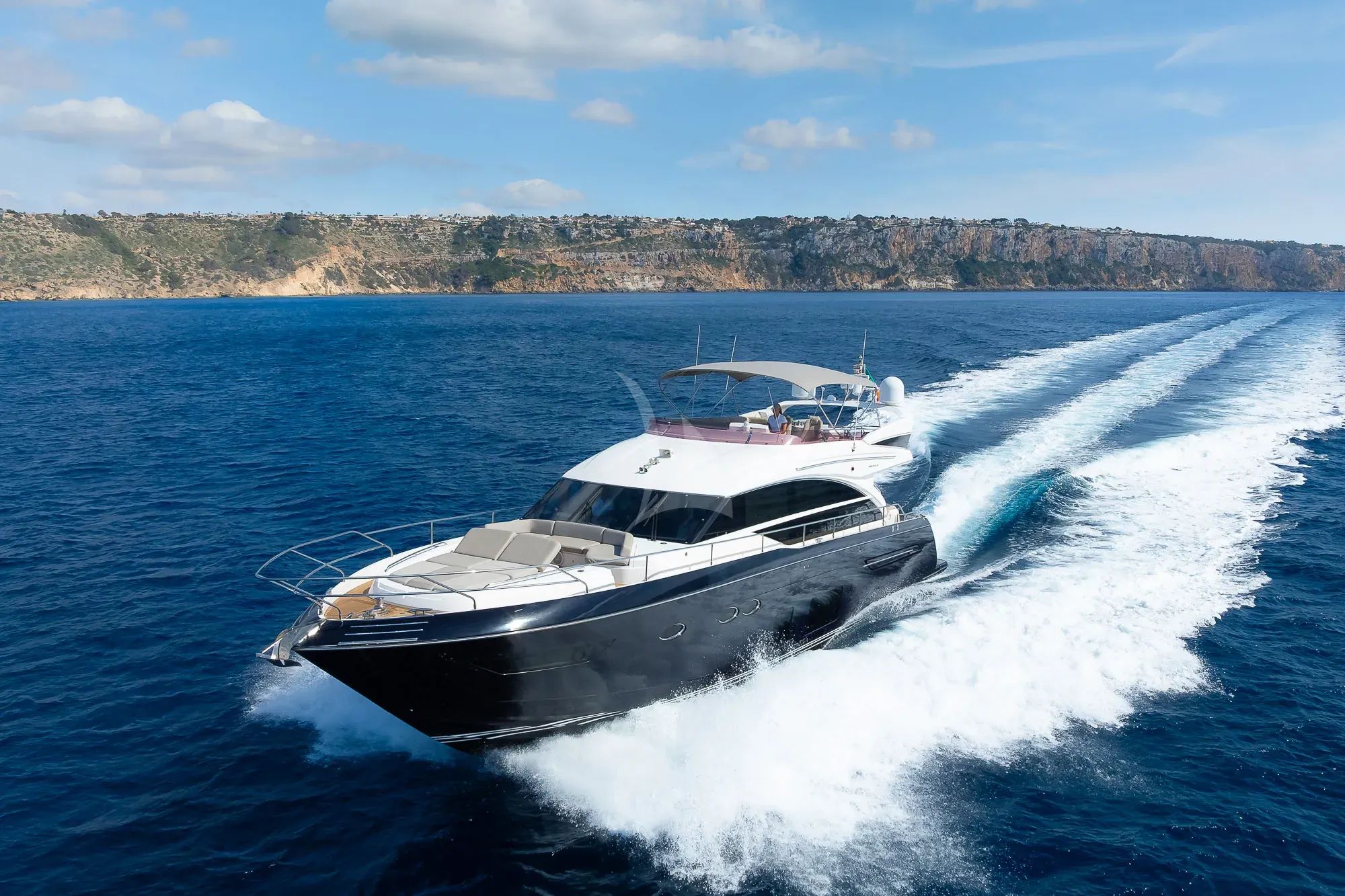 With a bold dark hull and a smooth 20-knot cruising capability, the Princess 68 ZEN VIBES presents a modern way to explore the Balearics with comfort and flair. Every onboard space is created to tempt guests into moments of recreation, meaningful conversations, and peaceful relaxation as they take in the island scenery.