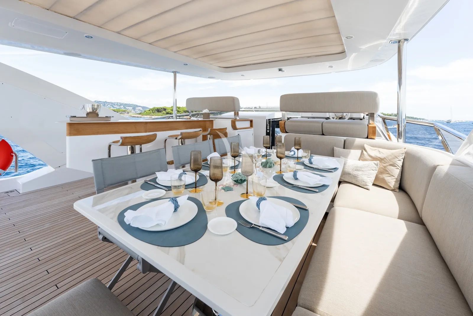 Palma mornings feel different when you are watching the harbor wake up from the deck of ZOZO, knowing your week in the islands is about to begin. The Azimut Grande 27m luxury motor yacht pairs a cutting-edge, sophisticated exterior with a smooth engine, so cruising between anchorages feels seamless and comfortable. Her state-of-the-art amenities are set up for recreation, socialization, and relaxation, letting your charter flow naturally from sun-soaked lounging to lively gatherings without losing that polished, effortless feel.