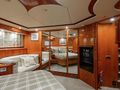 She has 4 sumptuous cabins, which are furnished to the highest degree. She is perfect for both family charters or a close group of friends. She has 3 en-suite bathrooms and all of the latest technology and home comforts for your time away. The master cabin features a lower and upper salon, the former incorporating a large, open plan galley and comfy lounge area and the latter a large dinette with surround seating and further surround sofa/lounge to starboard.