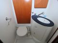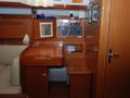 The galley to port has great appliances and lots of counter space. She has two refrigerators, and is equipped with a generator and air conditioners. There’s a forward-facing chart table aft of the salon, and two luxurious double staterooms with changing areas, hanging lockers, and en suite toilets and showers. Forward are two similarly well-appointed double cabins.