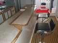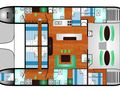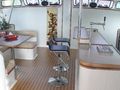 The redesigned cockpit has a huge raised dining table for 16 guests, offering a complete surround view of the scenery on a sailing holiday. The saloon has an L-shaped settee, plus galley with gas stove, oven/grill, 2 fridges, a freezer and expresso machine.